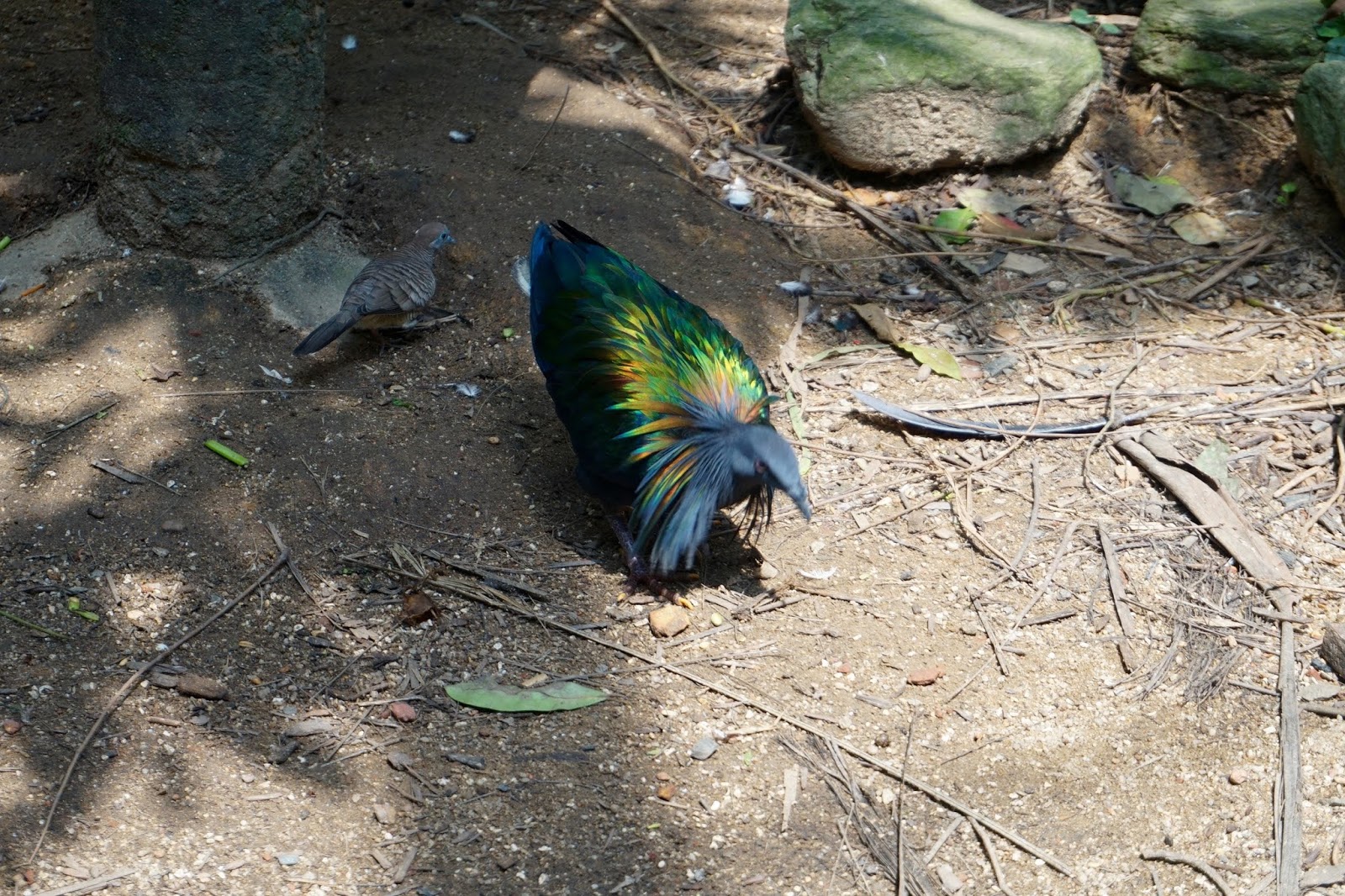 This one here is the Victoria Crowned Pigeon, looking a little regal like Queen Victoria perhaps, with her sombre blues, a feathered crown with white ends – like a tiara no less.