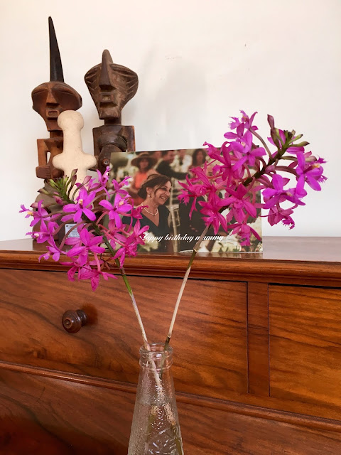 Its been a lovely week and weekend. As the new one starts I sit at my desk. There above me is a Campari and Soda bottle carefully brought back from Italy in the summer, bearing wild orchids now, the kind that Brisbane gardens seem to have an abundance of, and just behind, my Birthday card from George. There on the corner of my desk, one step up from the orchids, my African mama and papa, memories of an early married life, but also my Cypriot idol from some 3000 BC. This is my preferred place, my recurring vantage and one I am so fond of, writing and reading at my walnut desk, also a birthday present from Geneva days. On the other side a hand thrown ceramic bowl with an “M” motif, Gs creation, and a very old painted pot with visible signs of age and beauty carrying pens and pencils, an early gift from one of my first and dearest friends at University, Sophie Day. Moving around the world as we have done has meant that sometimes your nearest and dearest are elsewhere and this can be difficult and quite lonely at times. A quick glance up or a lingering look and they are never very far. This is the way to have them always by your side, looking up to them for renewal, remembrance and making relevant all that happens every moment of the passing day.