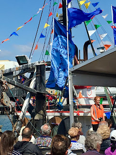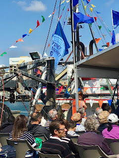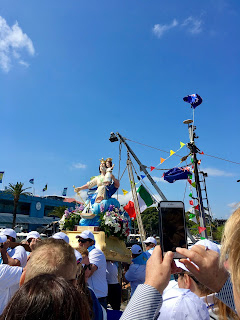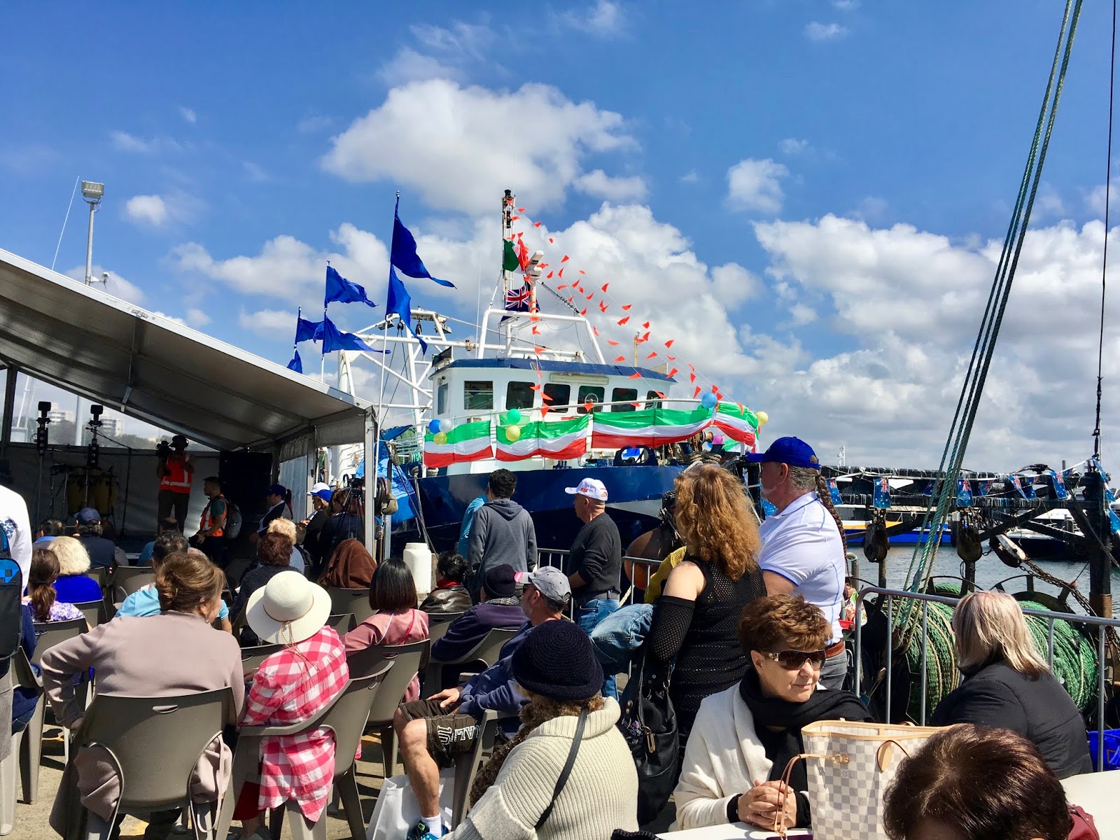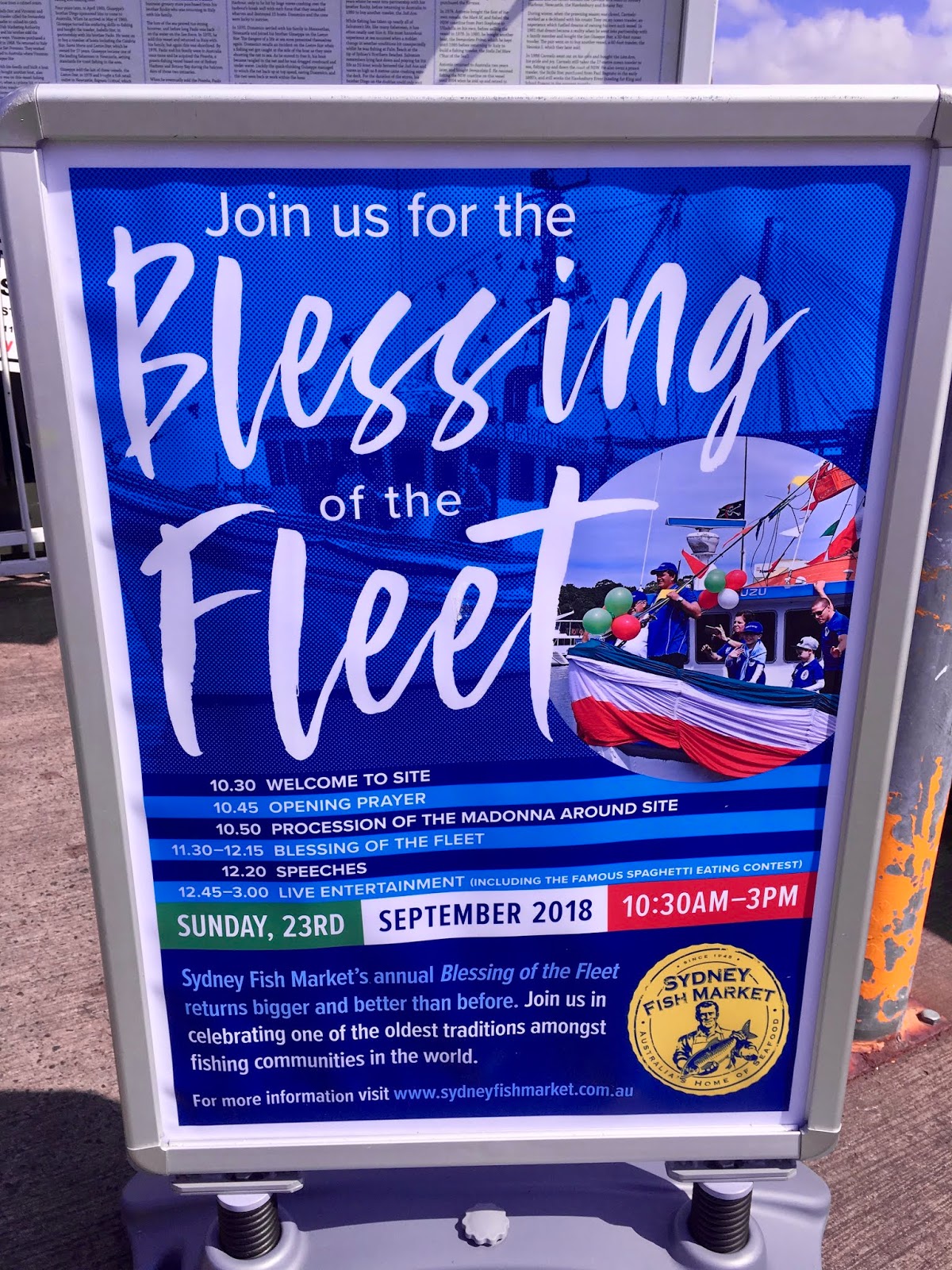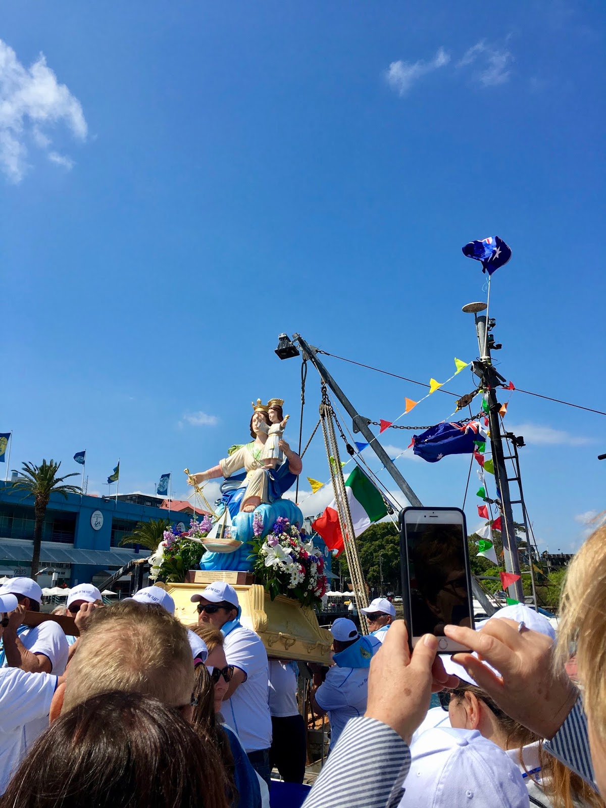 At this time each year a special ceremony is held and we just happened to be there for it. It is the day the Fleet is Blessed. This is one of the oldest traditions in fishing communities around the world and here it is celebrated in association with the Association Bagnara Calabra. The fish market’s success owes a great deal to the Italian Community of Sydney who were first involved. The name that is most mentioned is the Bagnato family who apparently dominated. There were other families as well who were involved at a later stage. The Italian community is here in force, an Italian Brass band with Italian colours on their uniforms is playing while a priest blesses the fleet, and calls everyone to prayer before the Madonna SS di PortoSalvo (literally translated as St Mary of Safe Ports or Safe Harbour) is paraded around the Fish Market grounds, followed by all the fishing families who proudly sport the T shirts. There are lots of activities organised for the day not least a spaghetti eating competition !