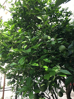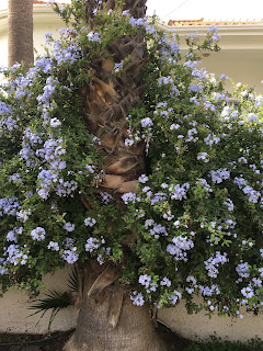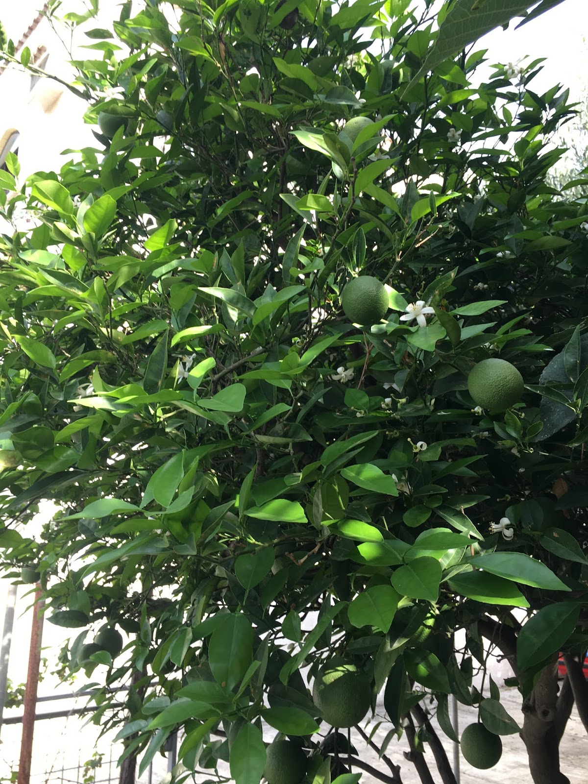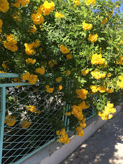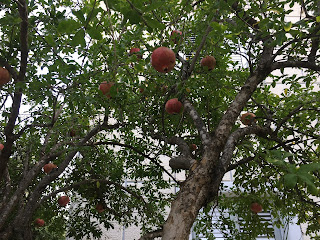 And yet and yet, the neighbourhoods where I live when I come back, are full of houses which bask in the sunshine, the pomegranates hanging from the trees, the lemons glistening green, the flowers cascading over the fences which can no longer contain them.
