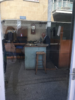 On the same road my eye spies a familiar figure from the back. An Armenian friend who I used to exchange some friendly and flirty greetings in my youth. He owned one of the many material and shoe shops there. He has been there day in day out since as far back as I can remember. Except that this time he turns round and faces me with a toothless grin. I am shocked and mercifully he doesn’t recognise me. Perhaps we both look ancient to one another and best to allow memories to stay in the past. I leave the main commercial Ledra St and head up to the car. In these backstreets the artisans had their shops. Mr Yiannis, the shoemaker, Mr Stelios and Mrs Koula the dressmakers. Now a handful, if that, of them are there. Using their old traditional methods of cutting the cloth, marking it with chalk, stretching the leather and hammering on the heels.