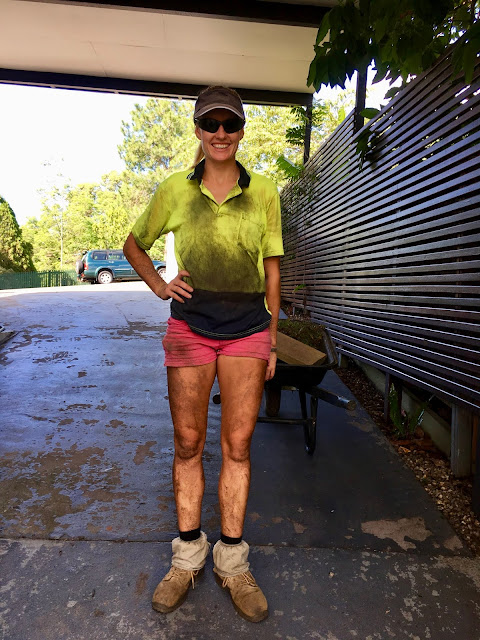 I organised an early Xmas present for the hubby in time for the Xmas party this weekend. Turfing of the lower garden. I found a great outfit called Desire landscaping, http://desirelandscapes.com.au and organised a quote.Quite like the name. The weather has been wet so it was touch and go whether they could do it but Ivan called and said it could all go ahead. They arrived super early- Ivan – big and strong, and two young women. Momentarily surprised as the job was a big one. Hot day – well into the 30s and humid. The lower back garden can only be accessed by a long walk down. Each bucket of earth was shovelled into buckets and walked down, then spread over the area and then the turf arrived to be laid and rolled.The worked all day with a couple of breaks in between. I was busy tackling the ironing so with an open door I could hear their banter, happy, respectful, giggly and fun with not a swear word escaping their lips. They worked solidly and when Ivan offered to take over a harder task they politely refused and carried on. By the end of the day this is what they looked like – gorgeous gals, fun loving, hard working, nothing prissy or precious about them. Hats off to the parents who raised them and to these young women above all. Australia, you put your money where your mouth is, and gender equality is alive and well.