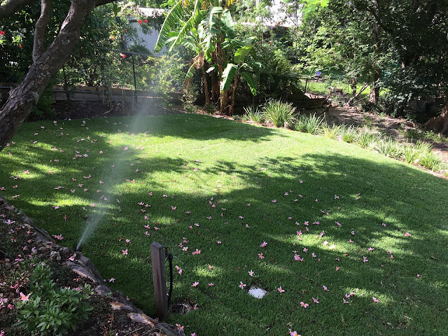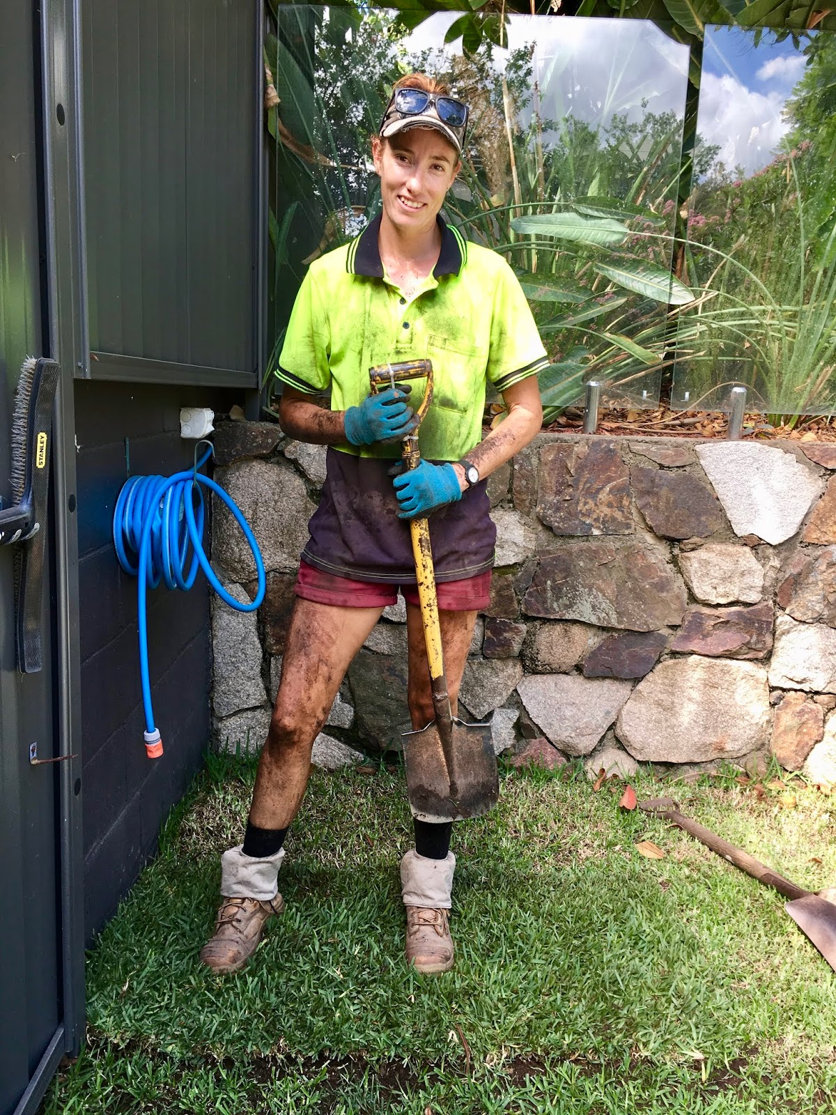 I organised an early Xmas present for the hubby in time for the Xmas party this weekend. Turfing of the lower garden. I found a great outfit called Desire landscaping, http://desirelandscapes.com.au and organised a quote.Quite like the name. The weather has been wet so it was touch and go whether they could do it but Ivan called and said it could all go ahead. They arrived super early- Ivan – big and strong, and two young women. Momentarily surprised as the job was a big one. Hot day – well into the 30s and humid. The lower back garden can only be accessed by a long walk down. Each bucket of earth was shovelled into buckets and walked down, then spread over the area and then the turf arrived to be laid and rolled.The worked all day with a couple of breaks in between. I was busy tackling the ironing so with an open door I could hear their banter, happy, respectful, giggly and fun with not a swear word escaping their lips. They worked solidly and when Ivan offered to take over a harder task they politely refused and carried on. By the end of the day this is what they looked like – gorgeous gals, fun loving, hard working, nothing prissy or precious about them. Hats off to the parents who raised them and to these young women above all. Australia, you put your money where your mouth is, and gender equality is alive and well.