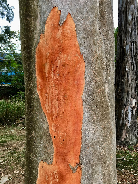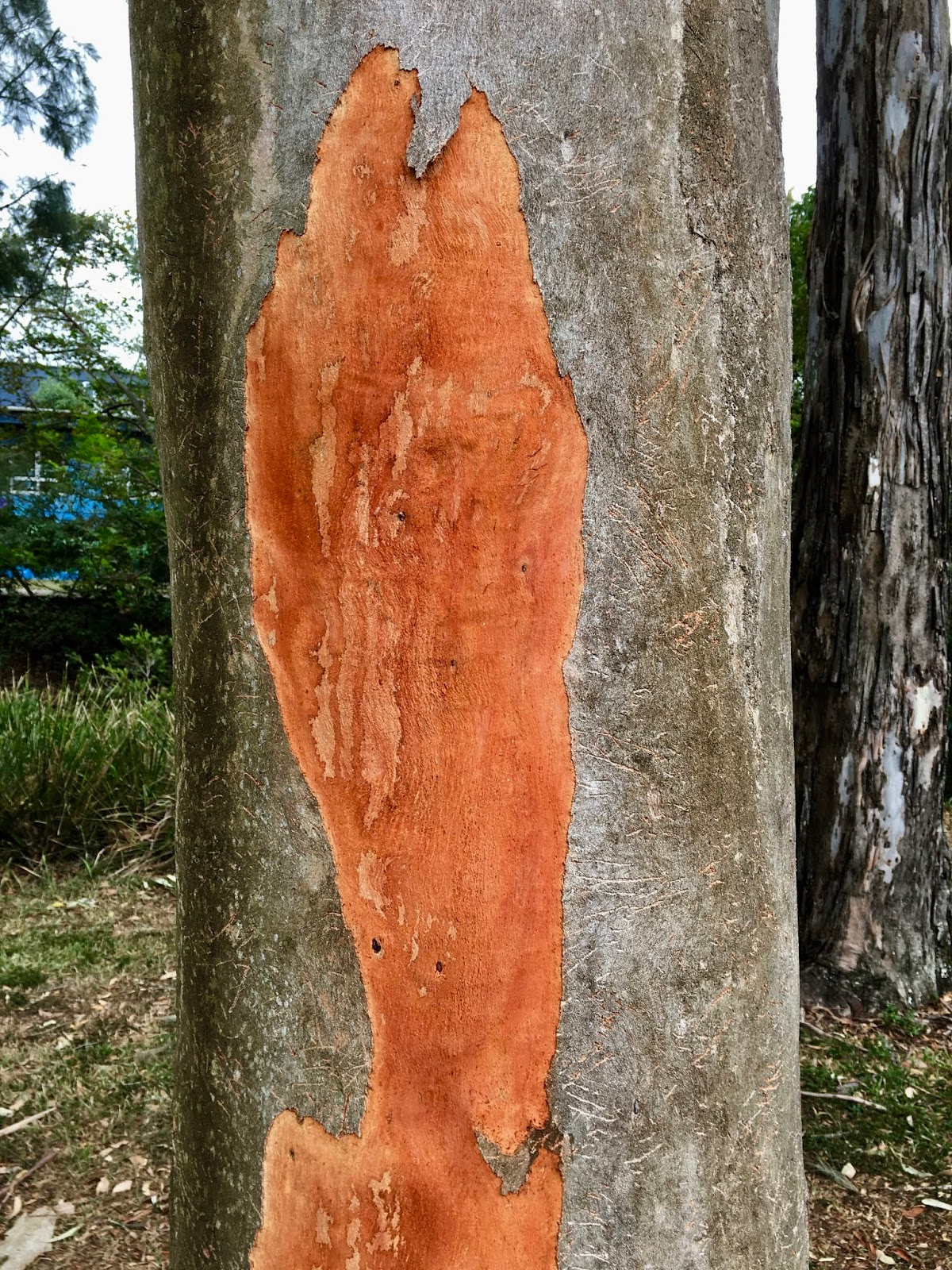 A grey gum, Eucalyptus Propinqua, blushing as its very orange trunk is exposed.