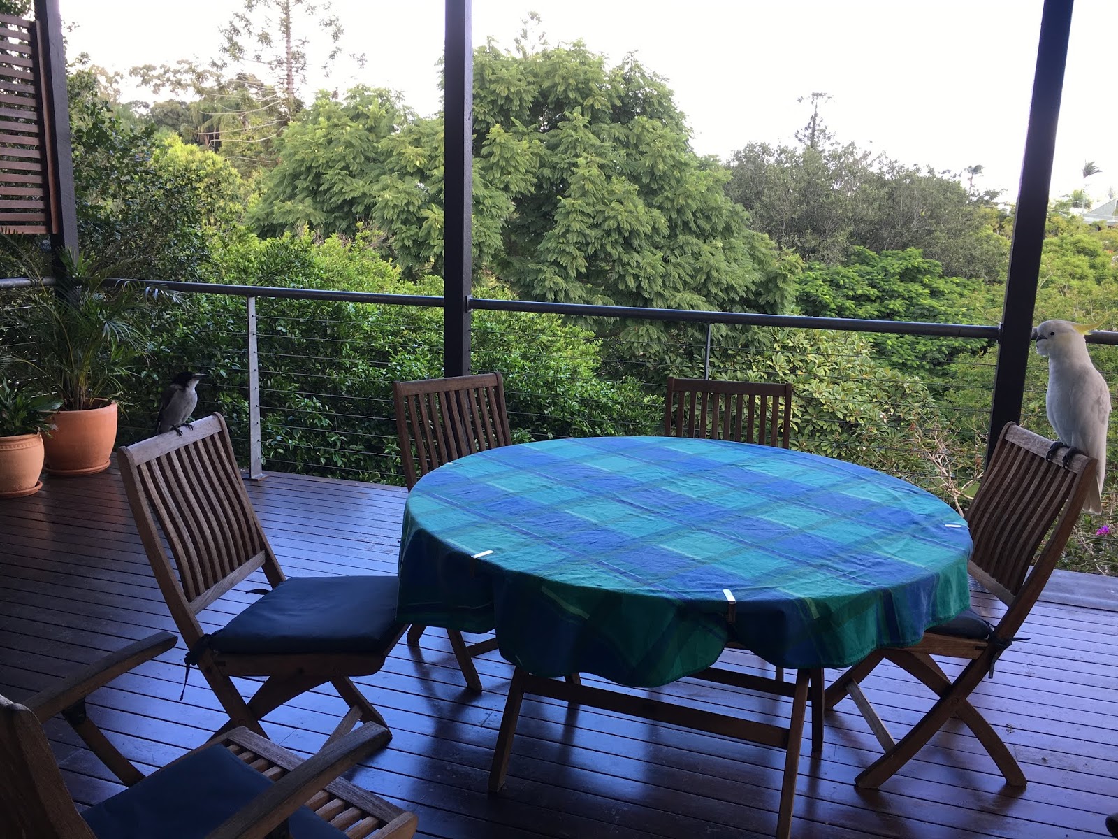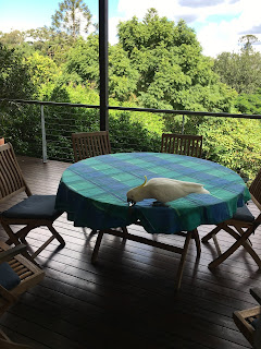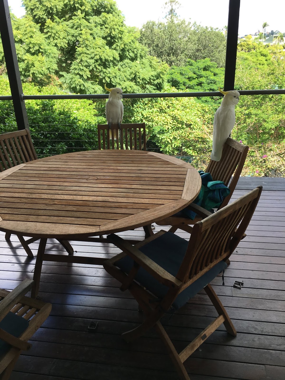 After a hearty Breakfast Cockie and Partner, feeling replete and well, were clearly getting a little bored. So they decided to spend the day on our deck and many a happy hour pushing the clips of the tablecloth off the table. As if that wasn’t enough one of them then walked on the table and with its beak lifted the entire tablecloth and pushed it to the side on a chair. I kept reminding them that perhaps this was yobbish behaviour to their breakfast provider but they indicated how much they thought of my lecture by leaving round little presents underneath the chairs they were perched on.