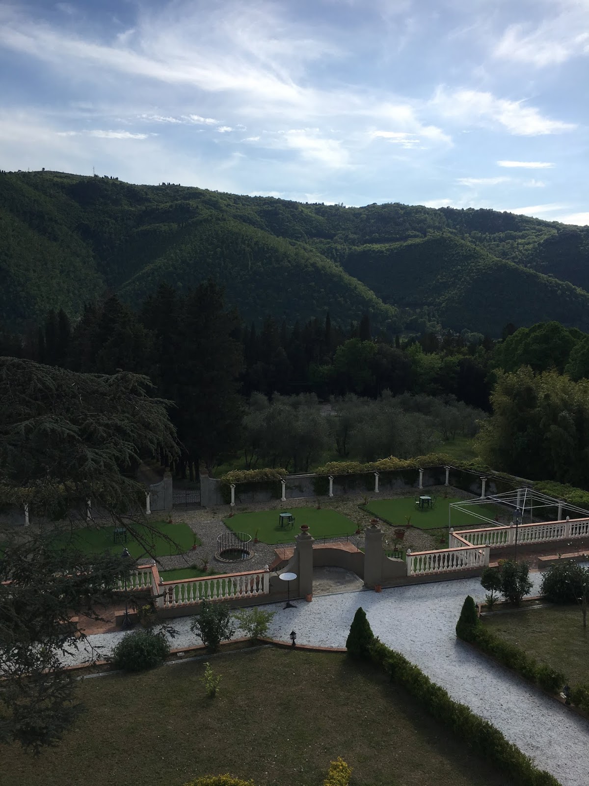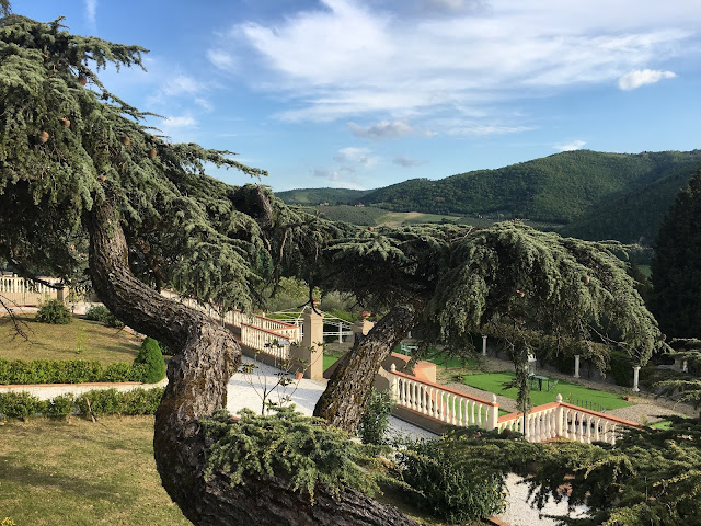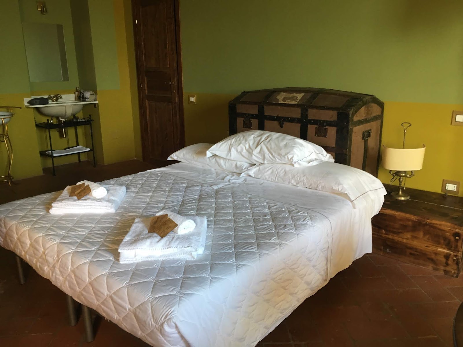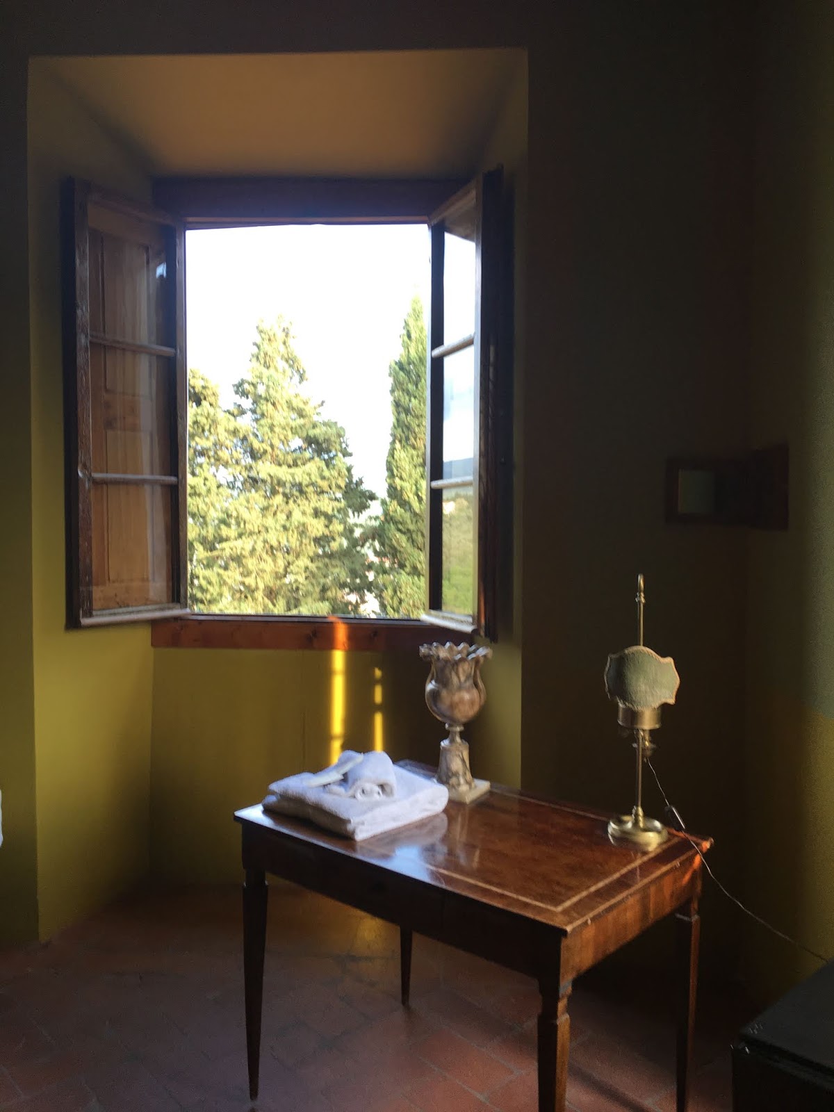 We arrived in Pontassieve in the early evening, a beautiful agri resort nestled in the side of a mountain near the National Park Casentinesi Forest nearby which we are looking forward to exploring tomorrow. Its rooms are quirky and individual with great big wooden wardrobes and marble urns, delicate wash bowls and crazy colour schemes in olives and mustard which bring out the intensity of the dark greens just outside the window.