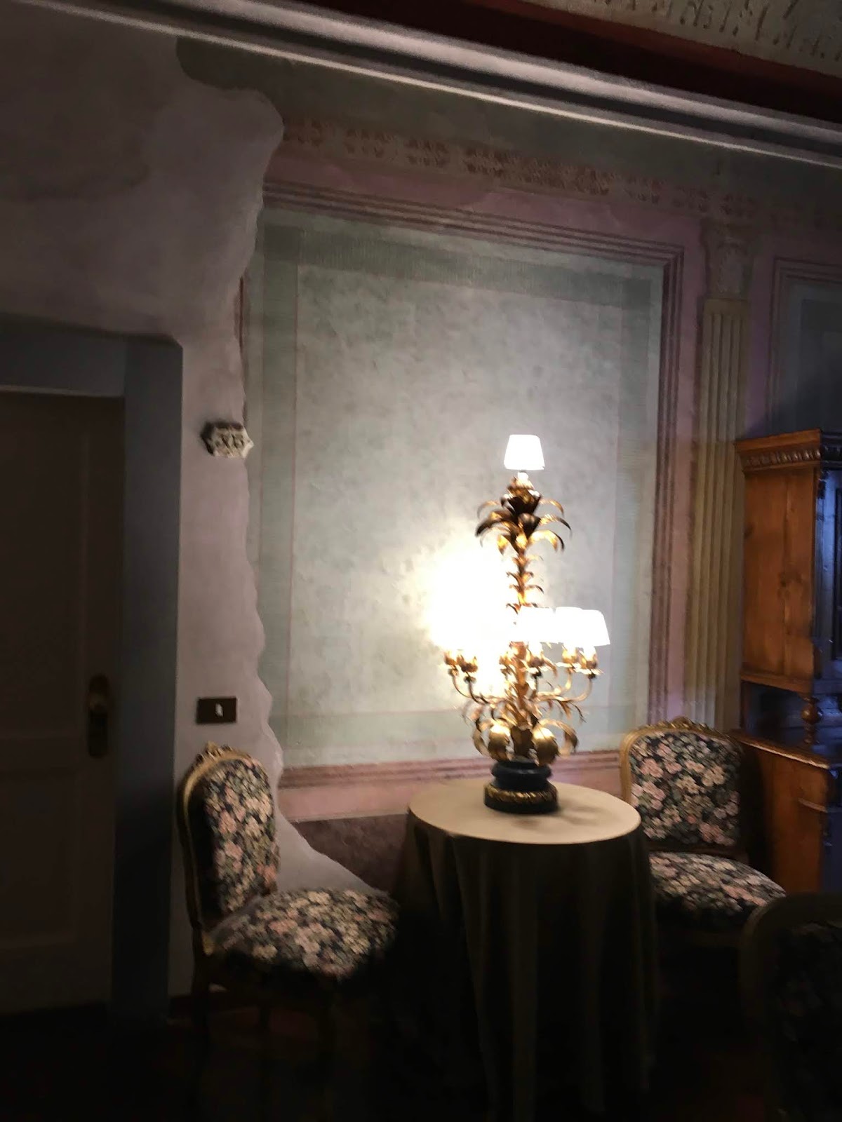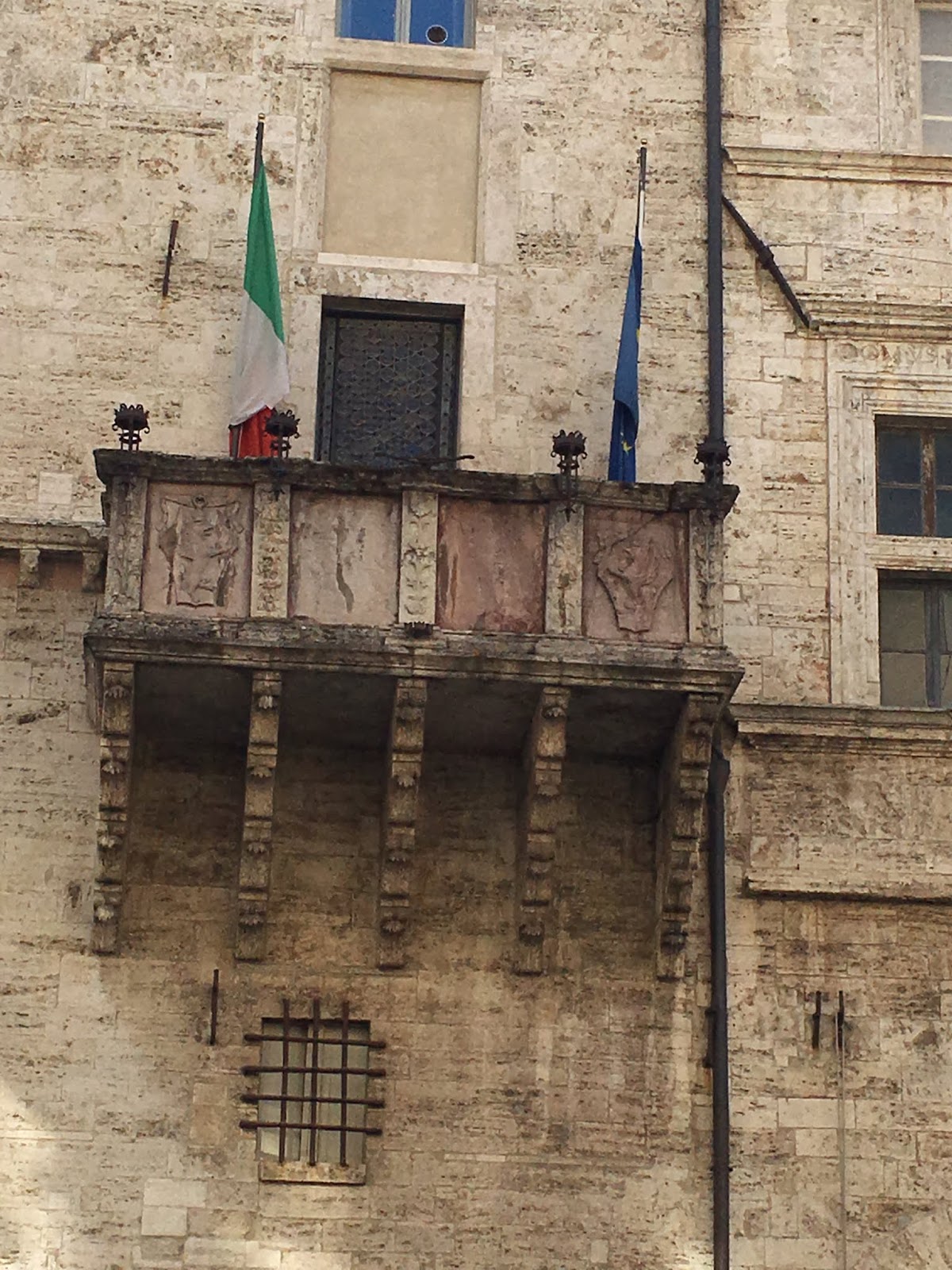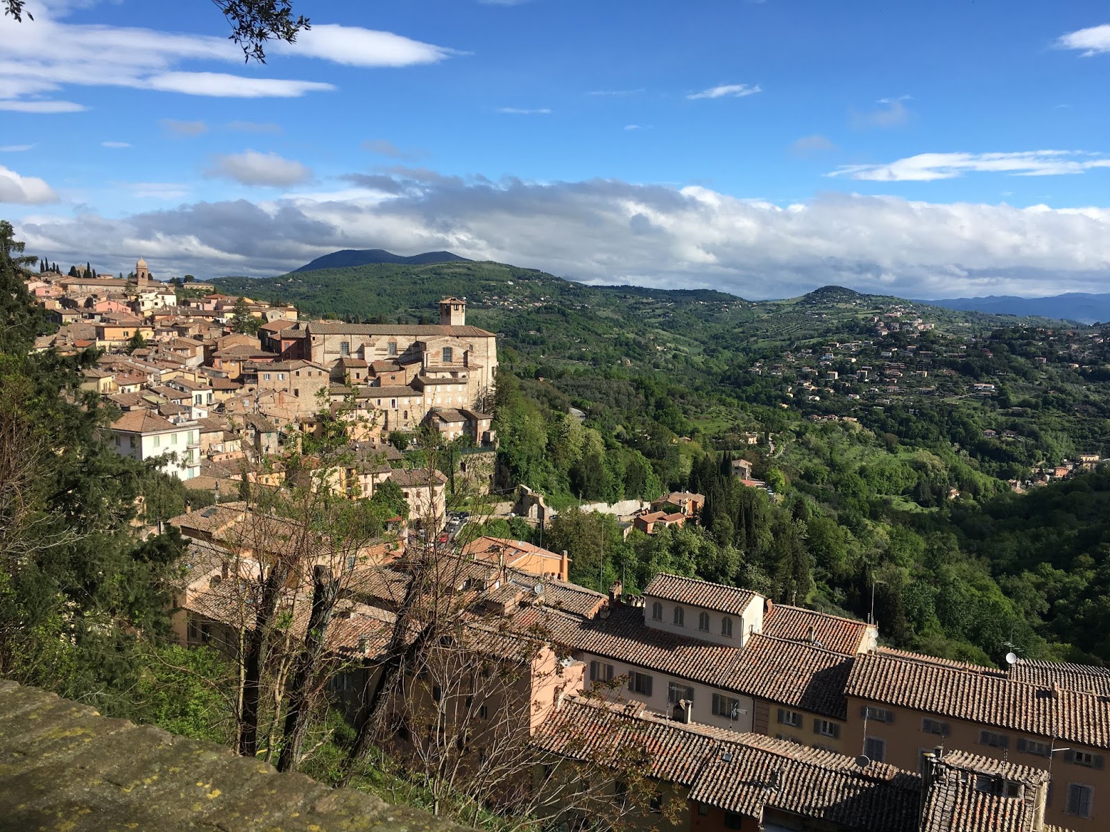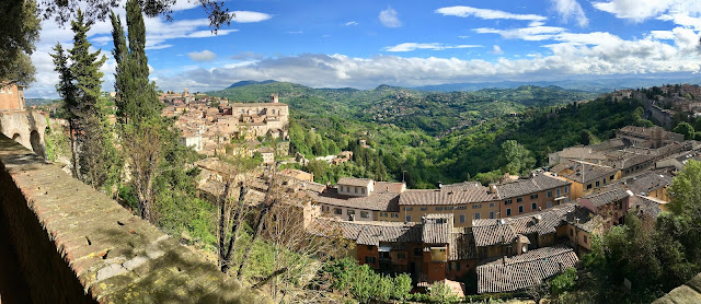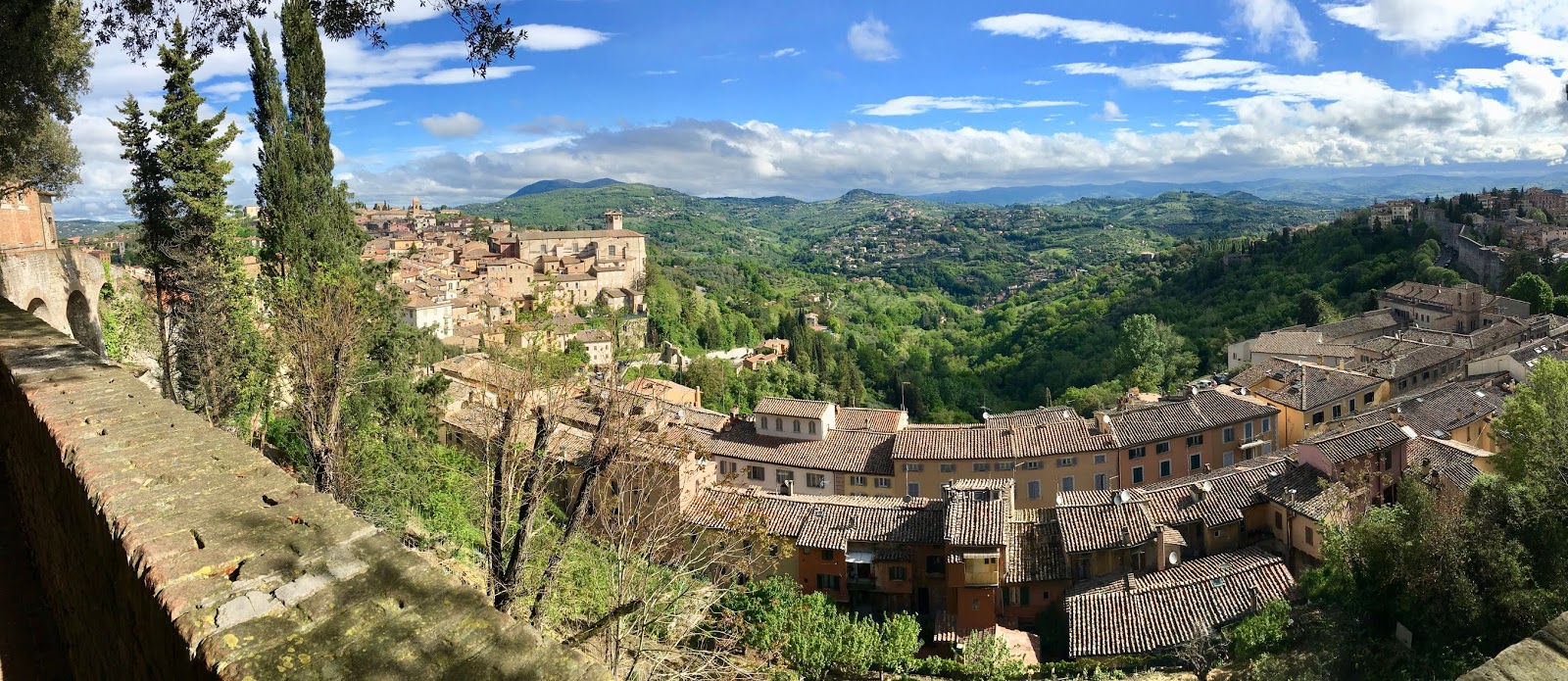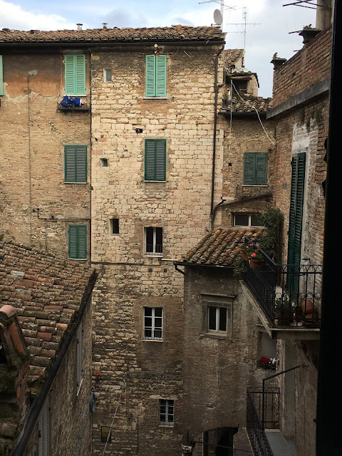 Perugia the capital of Umbria has all the picturesque scenes anyone can hope for. If you are staying in a hotel from the 1200s which has been restored to some of its former glory you have a heightened sense of what is on offer. The Fortuna Hotel is found behind a veritable wall of ivy – we had some difficulty locating it. Inside, the reception is not unlike most hotels, but exploring a little further and you find corridors with some of the original colours of the walls, lovely chandeliers with Murano glass, vaulted ceilings, frescoes painted on the ceilings and period furniture. There is a roof top with views over the city and a reading room with a painted ceiling. Rooms look out onto courtyards with tended pots on the balconies and flags of the Eu draped here and there. Charming and quirky it is just the perfect place from which to explore the historic capital of Umbria.