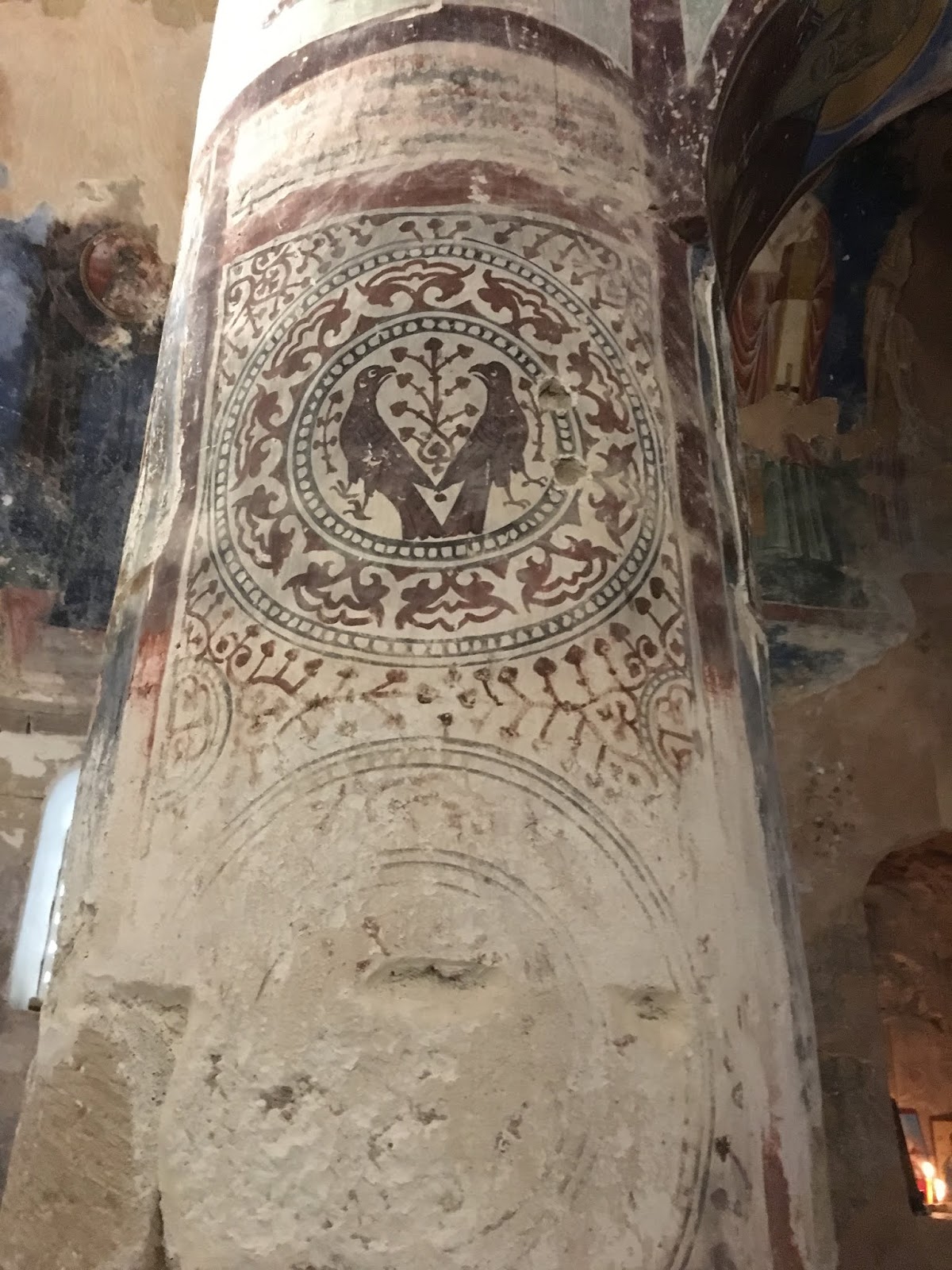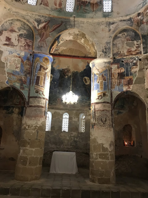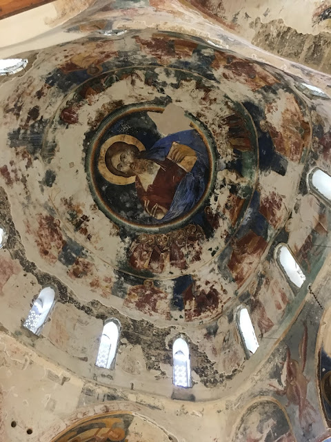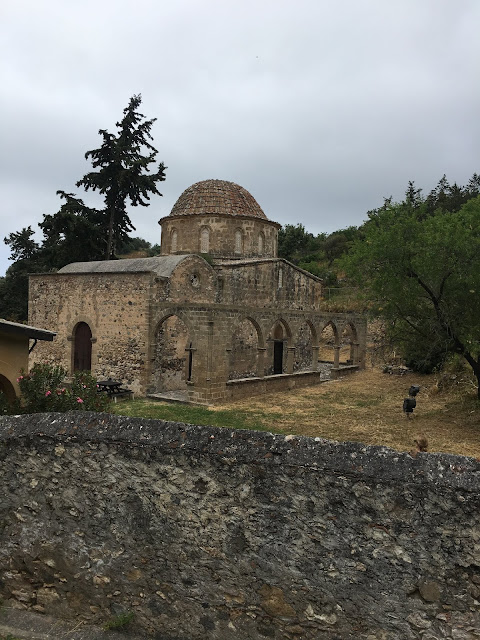 Down a deserted and windy road with magnificent views of the mountains and the coastline below we finally arrived at the Church of Antifonitis. Constructed in the 12 Century it functioned initially as a monastery. It is the one of the few examples of a single domed church with eight pillars which was extended over the ages. It contains frescoes from the 12th and 15th Centuries which are so very beautiful.