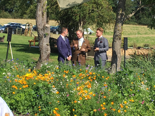 On the sunniest of days in Shropshire looking out over hills Charles and Nancy make their way down the carefully manicured lawn of Mulberry House towards the wedding venue. At the bottom of the field, the pond where the wedding took place and over to the side the marquees where we danced the night away. We are here to celebrate the marriage of Tom and Tristan in the grounds of the Morris family’s lovely home in Ryton.