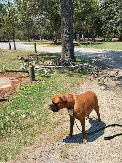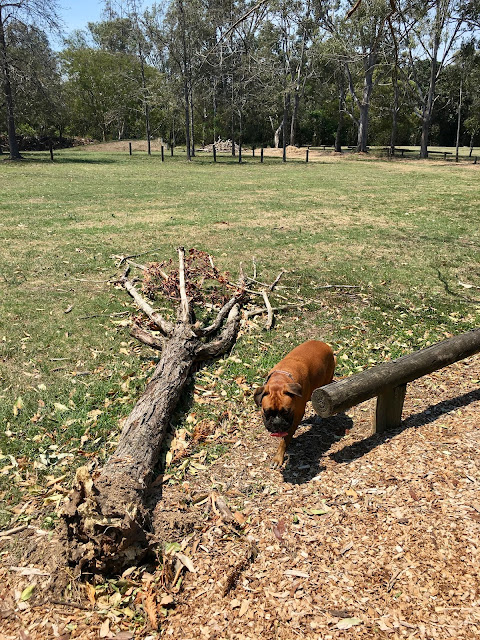 The winds are blowing from the west and they are hot and dry. Just what you don’t want when the land is parched and dry and thirsting for some rain. All day yesterday the branches swayed wildly and today on our walk the results were there – everywhere in fact. Dried small branches that had fallen. Big ones, whole trees toppled over. The leaves curling up, the blossoms fading and dropping. Its not a happy picture and Greta would have a thing or two to say about it.