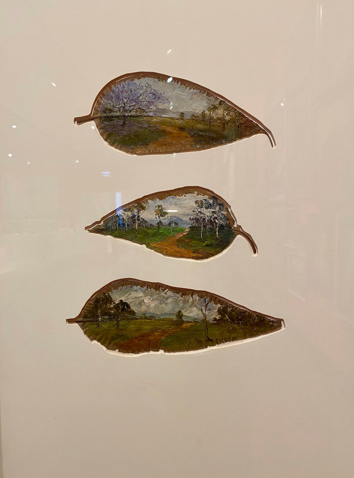 Jeanette Seldon took the shape of Gum leaves and put into them the most exquisite sea and land scapes which you can just discern in this photo.