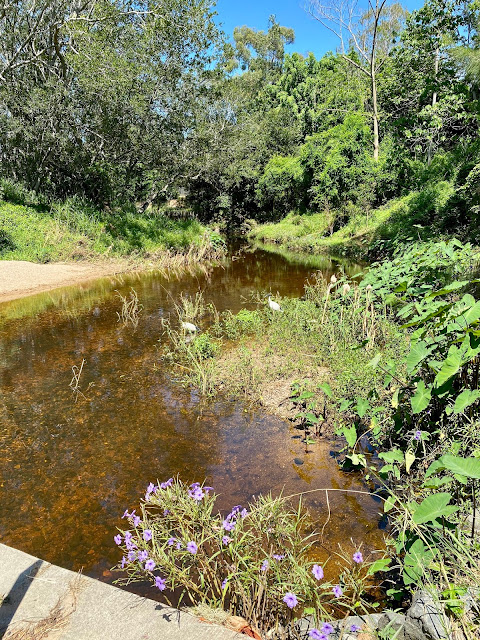 We walked down to the creek and the wildflowers are creeping onto the verges and the water is turning a tannin brown. It’s still cool and flowing and Dougall loves to jump in.