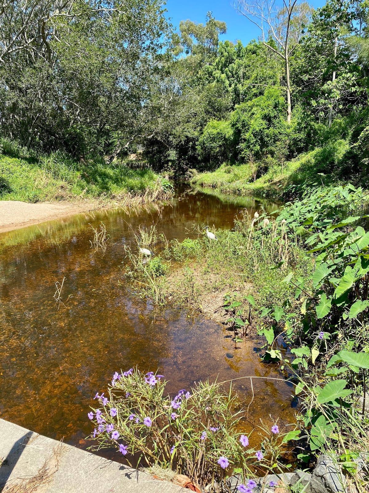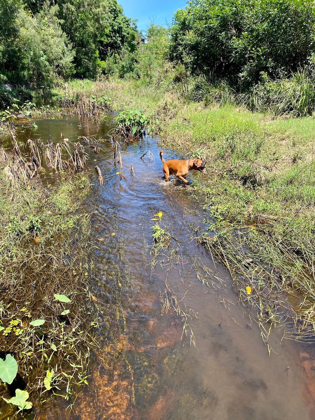 We walked down to the creek and the wildflowers are creeping onto the verges and the water is turning a tannin brown. It’s still cool and flowing and Dougall loves to jump in.