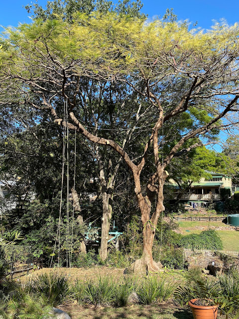 Today at 7 am I welcomed 5 strapping lads into my garden. Dave and Co from https://rightwaytreesolutions.com/ were here to rid our Poinsiania of the cactus and cat’s claw that had taken hold of it all these years and to give it a good prune as the branches were over extending and in danger of falling. Well I haven’t had so much fun in a long time, not just because they were all so lovely and chatty, as well as hard working but also watching the sheer expertise required to do a job like this. Dave made it look so easy. He was like Tarzan, flinging himself from branch to branch, issuing instructions to the lads below and doing a fine job of cutting off all the invasive weeds as well as the overhanging branches. My heart was in my mouth watching him as he seemed to balance on nothing and managed to handle his saw and the ropes all superbly. In the process I believe we disturbed a possum or two but they will be back together with all the birds tomorrow I am sure. Dennis and Doreen were perched on branches just above supervising it all!