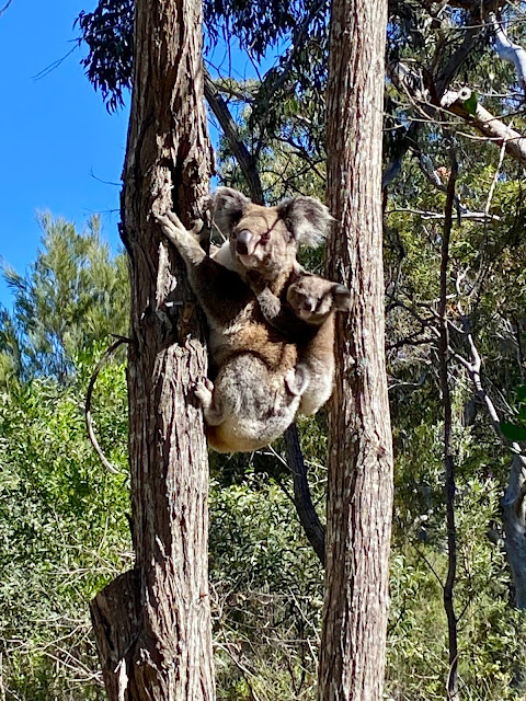 We have visited several times but this time was quite special, not only because it was our first outing in Corona Times but because we were also accompanied by our two sons who I have not seen since January. We could not believe the wildlife we came across but we all agreed that our top moment was this encounter with mum and bub as she was searching for some fresh eucalyptus leaves.