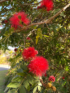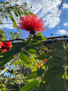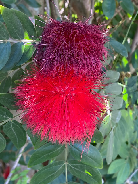This is the red powder puff plant -which always captivates me with its intense colour and daintiness. Strangely named Calliandra Haematocephala – and I can tell you without too much investigating this comes from the Greek and means of all things Good and Man and Blood and Head. Put it all together and you have a Hot headed Good looking man – which defies our perceptions when we look at this fine flower.