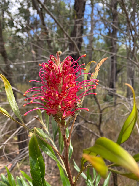 We walked around the base of Tibrogargan, we climbed to the top of Ngungun and Beerburrum and went on several other river walks in the Mooloolah National Park Jowarra section. The forest was largely eucalyptus and not very dense, interspersed with some grand old trees that rose majestically from the ground and whose tops we could barely see. The views were magnificent and along the paths we came across spring flowers and flowering wattles.