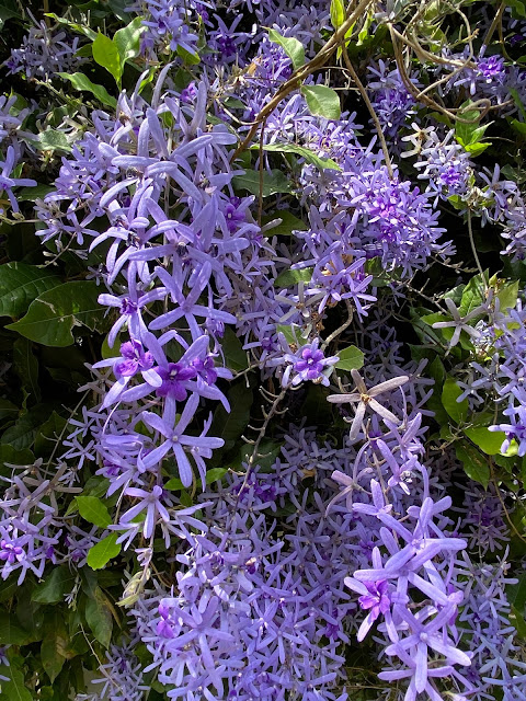 The story is that Dougall and I were walking in the neighbourhood when I was drawn to something looking supremely blue… We walked up and this is what we saw. It is magnificent and Dougall and I sat in awe outside it for a while. Then the owner of the house appeared. I asked if it was Ok for me to take a photograph. He immediately agreed and told me this is Petrea Volubilis, aka Queen’s Wreath or Fleur de Dieu. Oh mon Dieu you can see how that arose can’t you. After chatting for a while he offered to take a photo of Dougall and me. I could not very well say hang on I am just going to nip home, brush my hair change my clothes and put some make up on could I ? So we made an entrance just as we were. Here it is in its full glory and no apologies for the slobber. Capturing the moment is what it is all about!