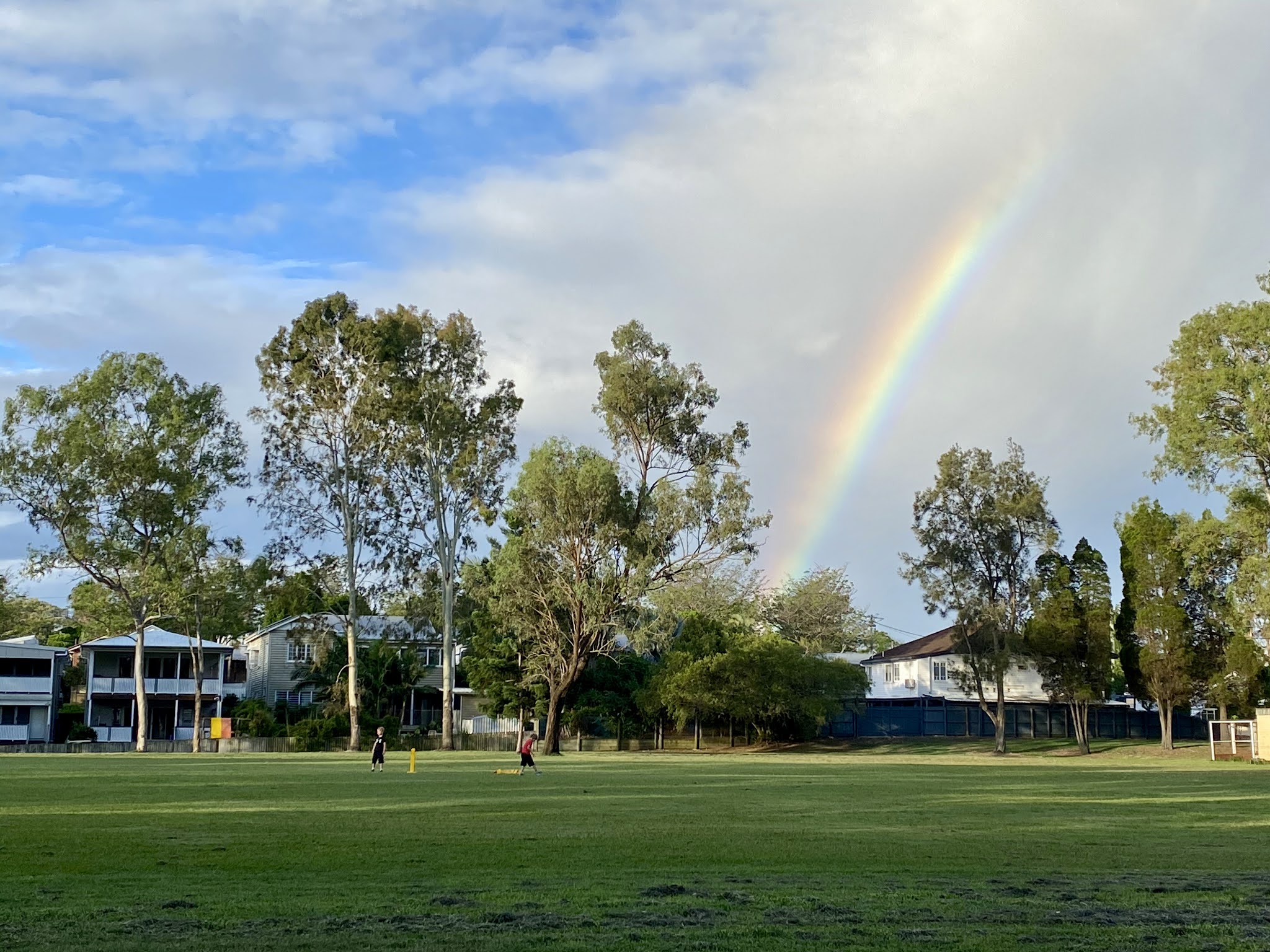 As I walk the sun is dipping in and out of the clouds and rainbows come and go in the sky. I see three. The parks are full of families and kids playing cricket.