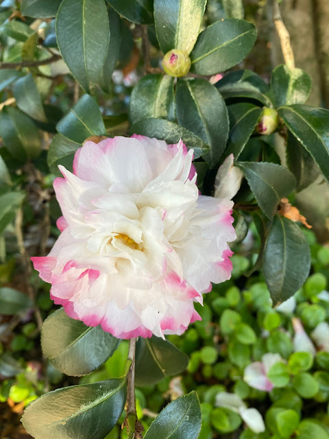 Today’s walk was not in my neighbourhood and Dougall did not come along. It was with the Gardening Group I organise which took us to a beautiful heritage home and garden in Clayfield to enjoy some of the Sasanquas in flowers and some Japonicas. The flowers are exquisite and the varieties are as plentiful as they are flowering. Just beautiful in the autumn light and then the unusual, for Brisbane at least, of a creeper with those strong autumn colours was just the fiery flame we all needed for our day.