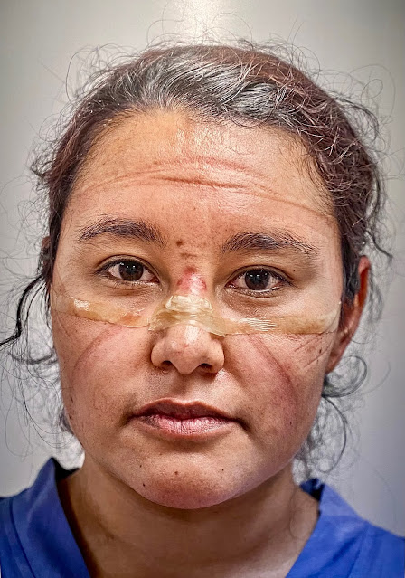 A doctor stands at the end of her shift, the marks left by the protective masks and goggle visible on her face.