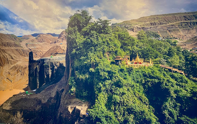 A buddhist temple occupies half of the mountain and the other half is a massive jade mine.