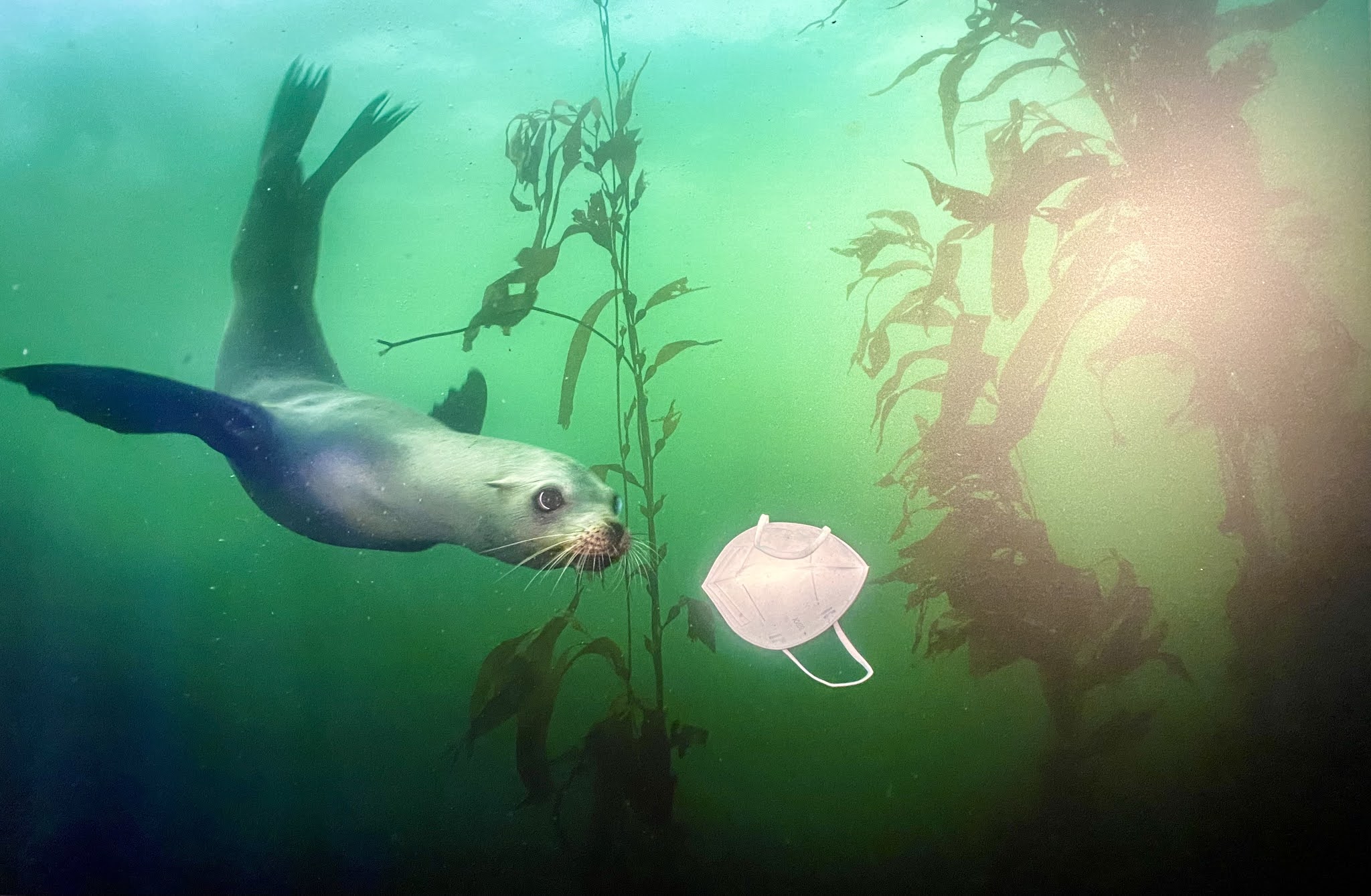 A California sea lion swims towards a face mask. The BBC reported that 129 billion disposable face masks and 65 billion disposable gloves were being used during the pandemic EVERY MONTH.