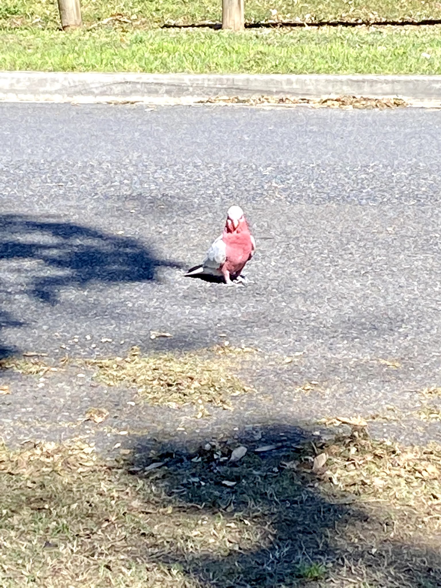 Very pink galahs crossing the road, butchers in trees and flowering orchids in the fork of a tree.