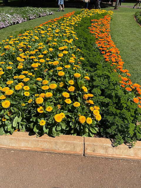 From there onto the Botanical Gardens which has trees over 150 years old. They are majestic and tall and provide wonderful shade under which to sip a coffee or listen to live music – then back into the flower borders which are so beautifully organised and colourful. Some names we laughed at. This Pansy so delicate and lovely, was called the Dynamic White Blotch!