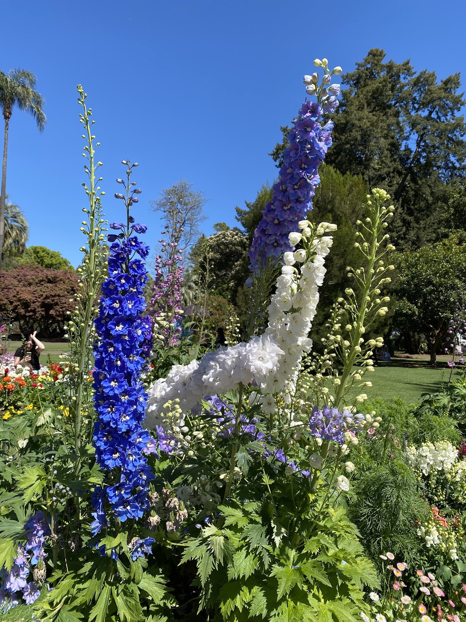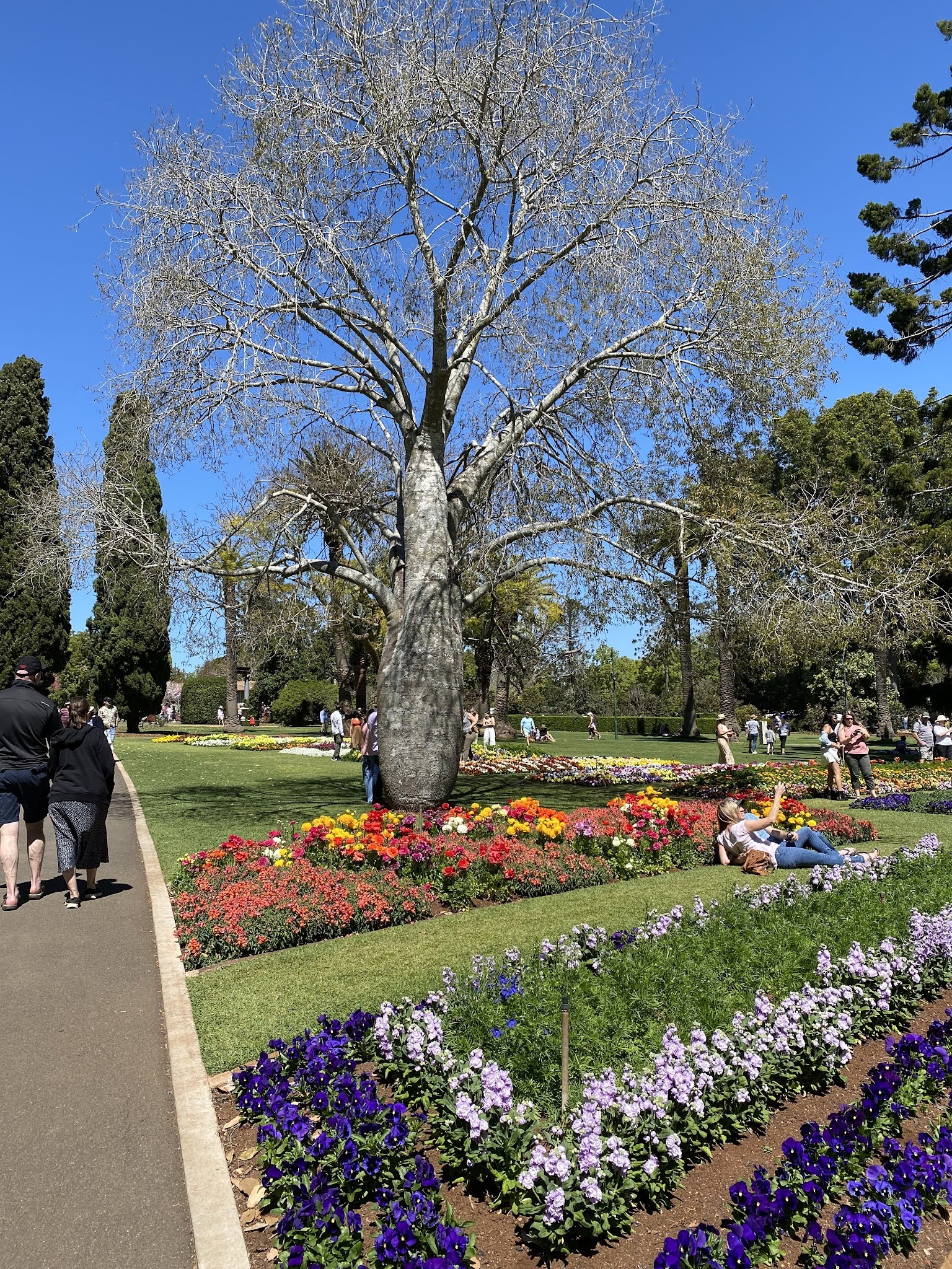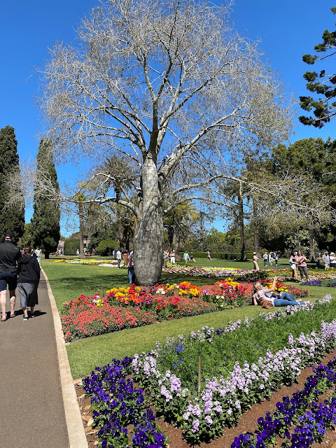 From there onto the Botanical Gardens which has trees over 150 years old. They are majestic and tall and provide wonderful shade under which to sip a coffee or listen to live music – then back into the flower borders which are so beautifully organised and colourful. Some names we laughed at. This Pansy so delicate and lovely, was called the Dynamic White Blotch!