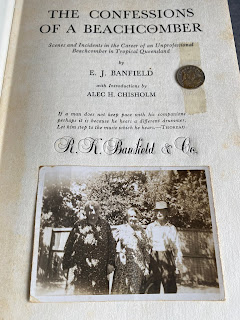 I have just had the privilege to read “The Confessions of a Beachcomber” by E.J Banfield. Lent to me by a descendant. Published in 1908 it is the story of E.J Banfield who was born in Liverpool. He emigrated to Australia in 1854 aged 2. He followed his father into printing and journalism until he found it exhausted him and he took off to Dunk Island off the coast of Queensland where he spent the better part of a quarter century until his death in 1923. He lived on the island with his wife Bertha and he wrote the book about what he saw around him. He describes all the fauna and flora in great detail as well as all the fish, turtles and dugongs in the ocean. He talks about his encounters with Aboriginals on the island and some of their hunting habits. It’s a fascinating insight into the little island and how this man chose to live a better simpler life. Apparently it was quite the bestseller and he became a well known personality, an early day celeb.