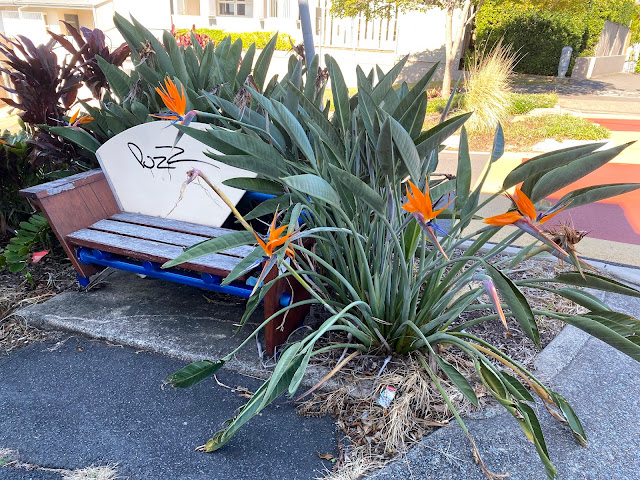 A park bench in amongst the birds of paradise – who would not want to sit there.