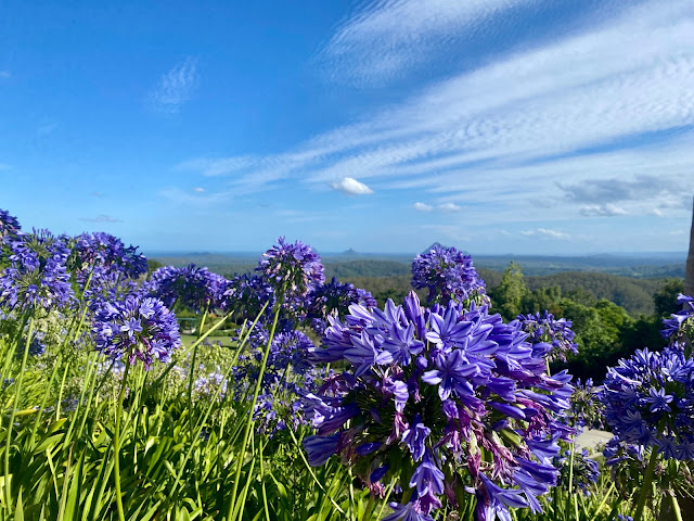 After a week at home I was itching to get out and we had promised George a trip to Maleny to see if we could spot elusive platypuses in the Obi Obi Creek. We started our day trip in the magnificent Maleny Botanical Gardens set up by Frank Shipp, a South African immigrant from Durban – he purchased the land with a view to create beautiful gardens. He landscaped ponds, lakes and waterfalls and the gardens were opened to the public in 2012. The following year he opened the Bird house which looks after many rescued birds – parrots which were once pets, injured birds, rare species. It’s just a delight and especially now when the agapanthus flowers dominate the area, giant balls of blue blossoms swaying on their strong stalks. Borders of blue – with the occasional white flowers just to break up the colour palate.