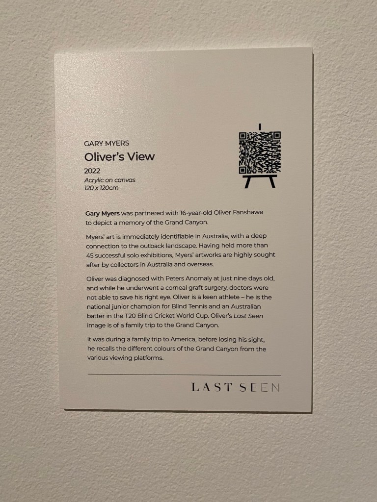 This is the title of an amazing exhibition I had the pleasure of going to this week. It is a collaboration between The Queensland Eye Institute Foundation, Griffith University and Publicis Worldwide. It has matched 10 vision- impaired Australians with artists who were tasked with recreating the vision they last saw before they lost their sight or their most cherished memory.