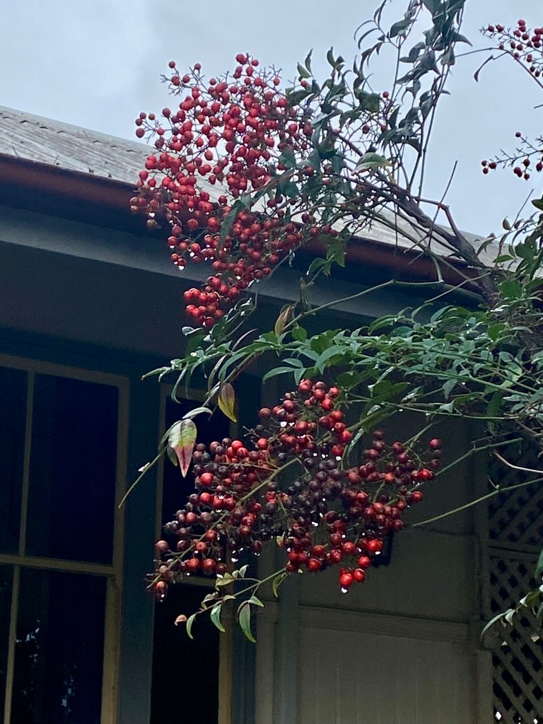 I love those raindrops suspended on the berries. The dew on the Poinsettias.