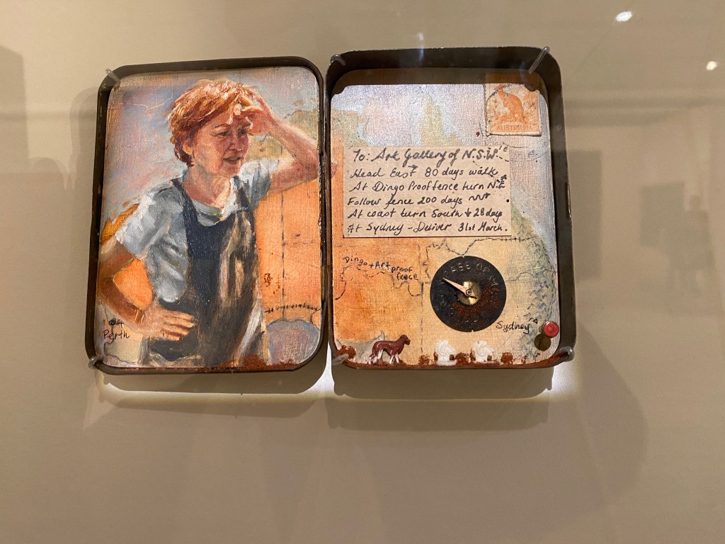 ‘It includes small items such as broken watch parts, an old stamp and sand. For the address label, I calculated how long it would take me to walk to the Art Gallery of New South Wales if I was fitter and took Sundays off to treat blisters, she says.’Given that the work explores the difficulty of making it into the Archibald, the irony of its acceptance is not lost on me.’