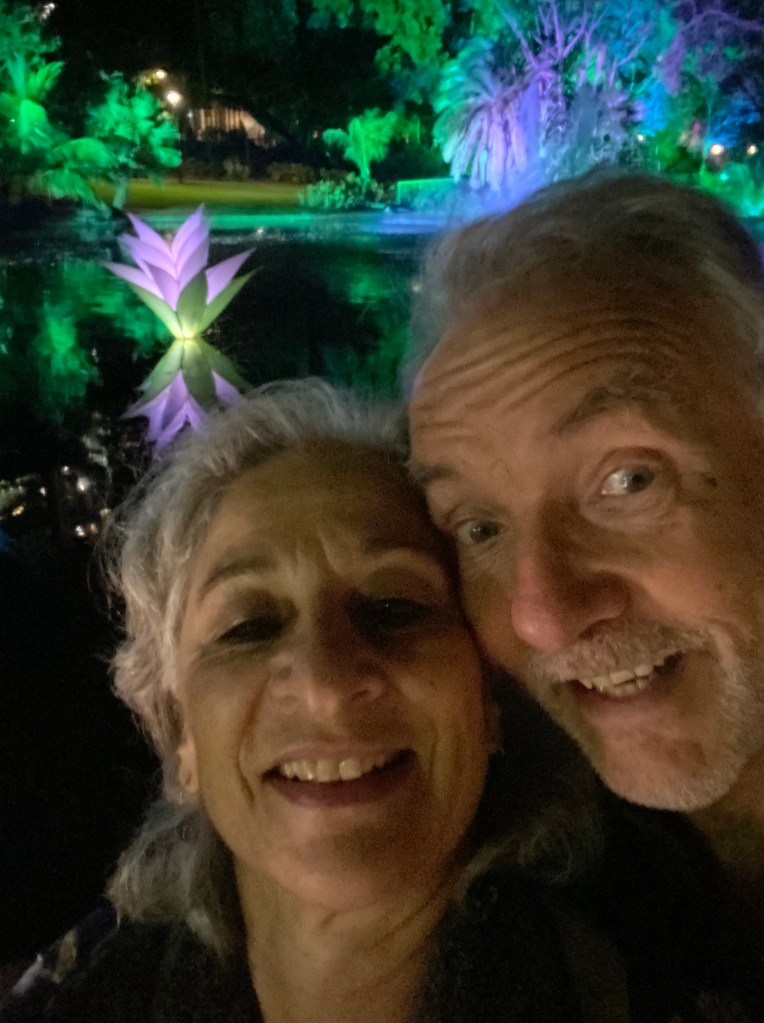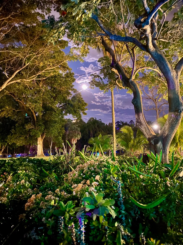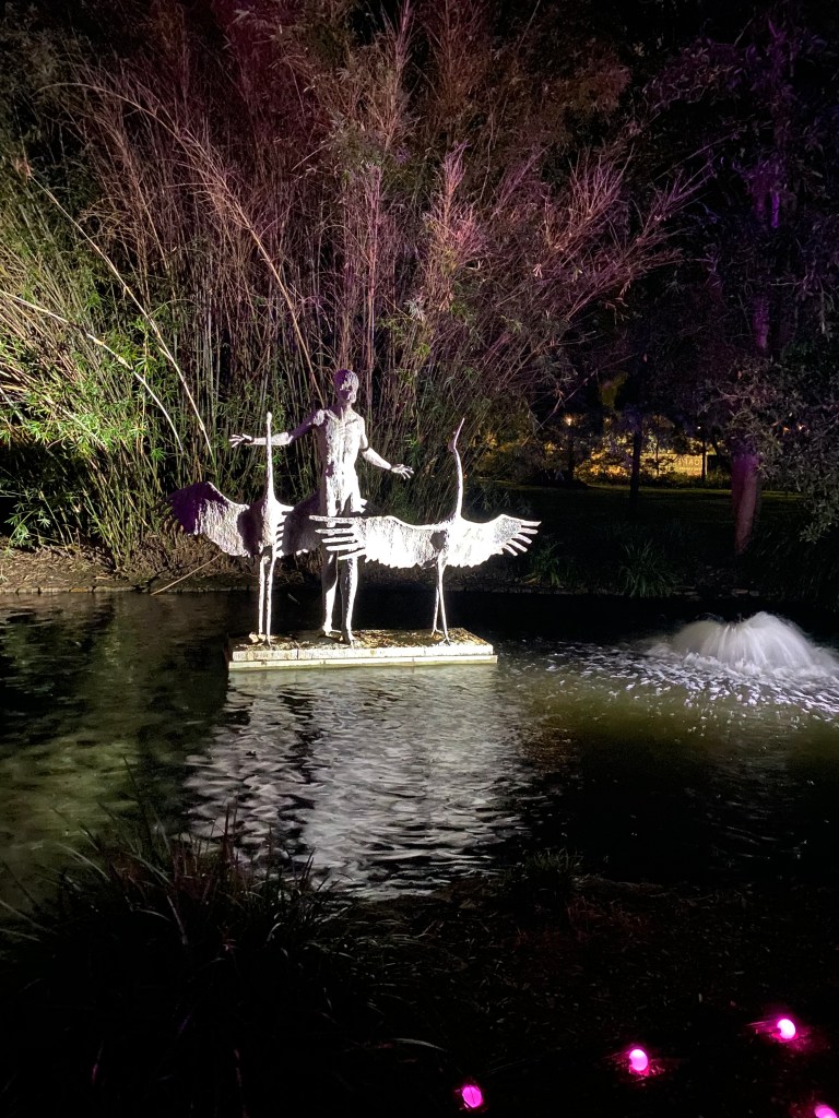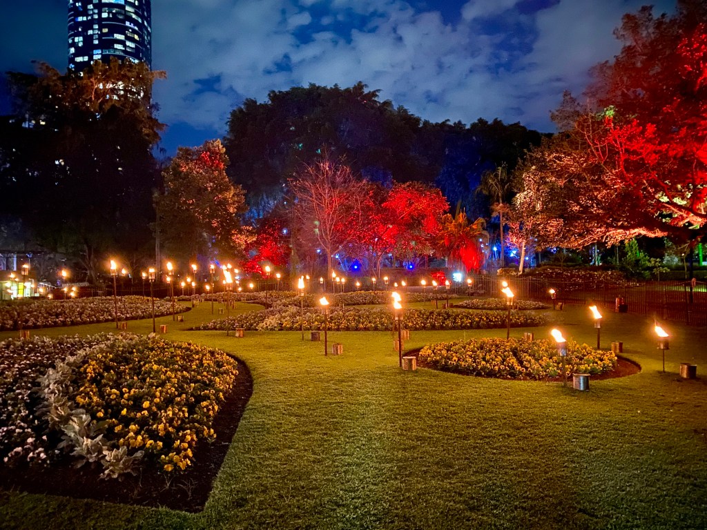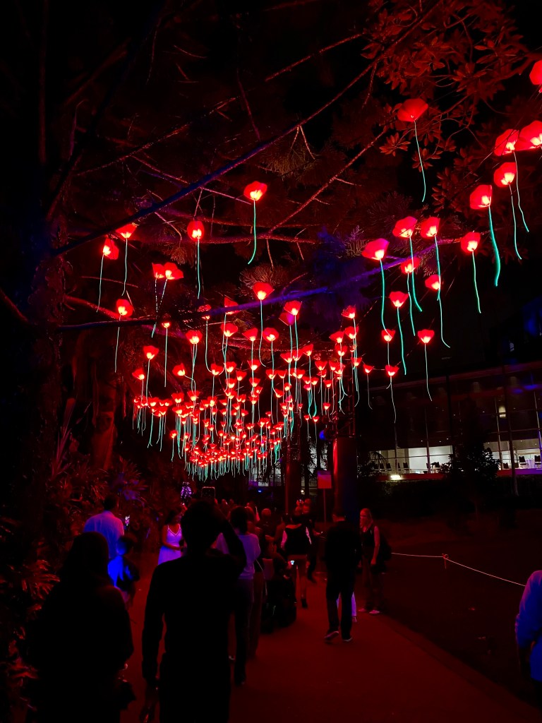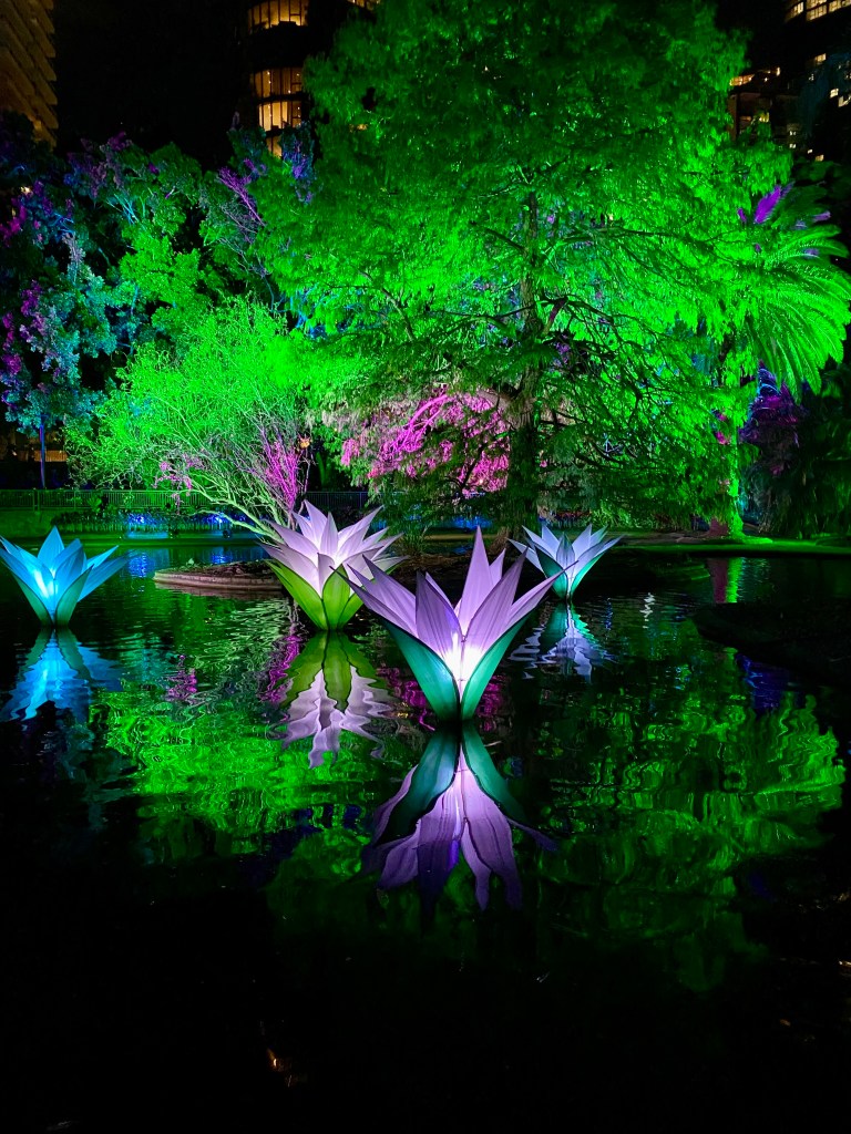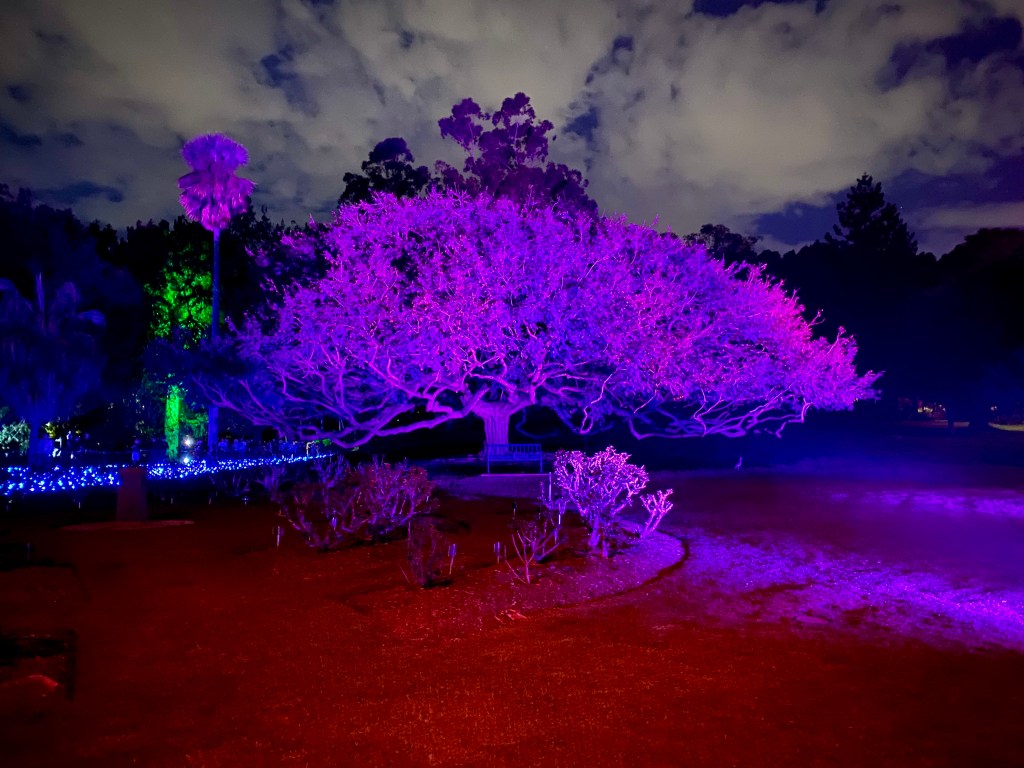 Today is the first day of Spring. Our Garden is already excited by its arrival. The first of September also marks the beginning of Brisbane Festival with a multitude of performances, events and concerts in many parts of the City. I dragged the Beekeeper into the City’s Botanical Gardens in the early evening for Lightscape. The gardens welcomed many visitors as we made our way through the trail. A beautiful night, a Blue Supermoon, a lovely temperature, and musical scores to accompany the many changing parts of the Lightscape spectacle.