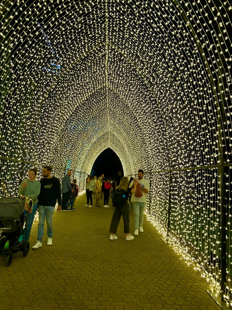We walked through exploring the colours and music, rivers recreated with lights of shimmering waves, fireflies dancing on the plants, bamboos swaying in the lights, a fire garden, palm trees lit in their entirety, kaleidoscope paths and neon lights on fig tree roots.