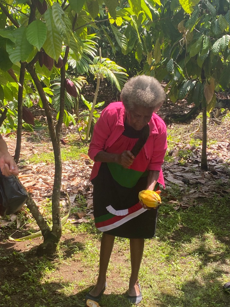 Onto Florence’s Cocoa Farm where she splits several pods for us. We suck the sweet seeds which in fact are then slightly fermented and then dried. They are exported to countries like Australia where milk and other ingredients are added to make the chocolate products we all love.