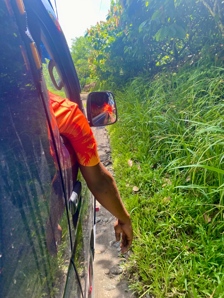 One arm permanently dangling out of the window. You can excuse this – its devilishly hot. Our guide is Otto, perhaps appropriately named in that we are in the Bismarck Archipelago. Off we go through Palm Oil plantations which clearly are a source of income for them to the University of the Environment and Natural Resources. Otto who speaks Tolai is a student there. He tells us there are over 800 language groups in PNG. Along the murran road, thick vegetation, many bananas, cassava plantations, custard apple and jack fruit trees.