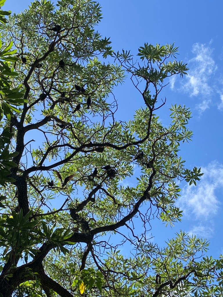 They nest on the branches of a lot of the trees in the forest but their favourite is the Pisonia tree. In the mating season around Sept / Oct time the male takes to the skies and does pivots and dances and sees which female can keep up. When he has chosen a partner they return to a tree and the female chooses her spot and then the male’s job is to find choice Pisonia leaves for the nest. The female can throw them out if she deems them unsuitable but if it is a good one she will keep it and poo on it and gradually more leaves will be added on which she will lay a small egg. The Pisonia tree has sticky buds and some of them get distributed by the birds so it is symbiotic in a sense.