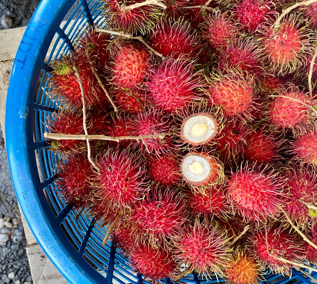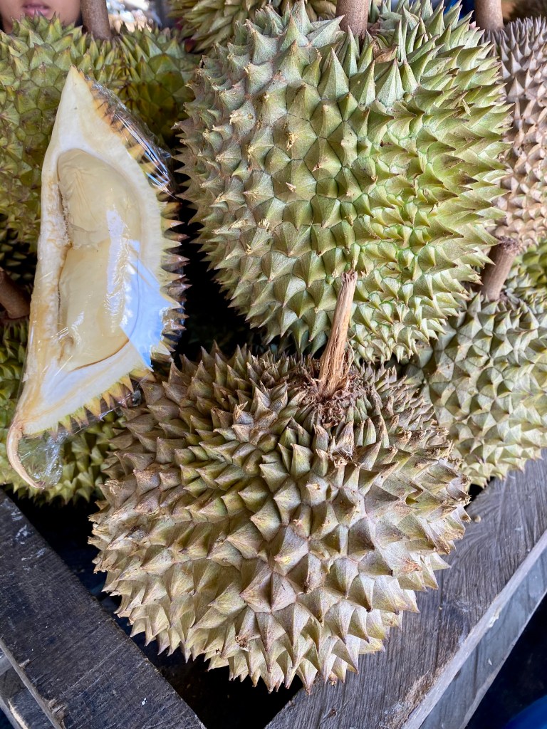 Along the road market stalls with lots of Durian. Twas the season.