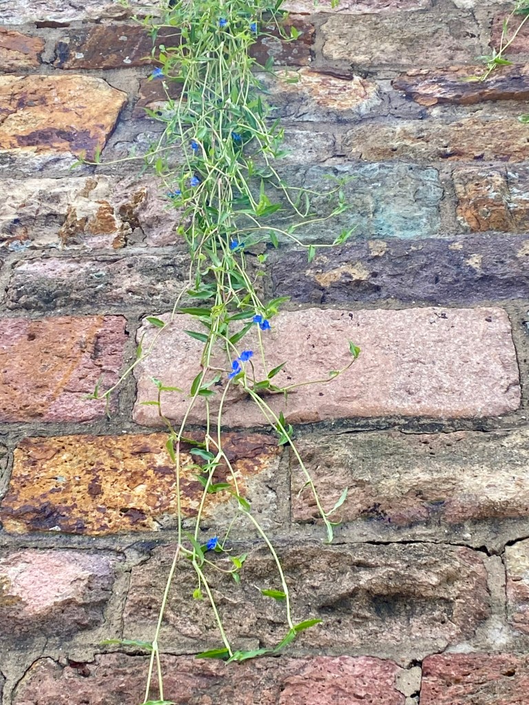 The delicate blue flowers of a well adapted weed hanging off a wall of Brisbane tuff.