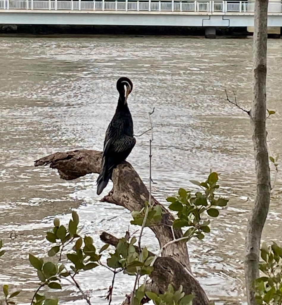 The land sighs patiently and gulps a few times – the volume of water is overwhelming and immensely powerful, and as we are soaked through California burns. It is the way of the world, and the direction we are heading rather precipitously. The dark ominous grey softens to an almost golden glow as I come across this dartar on a branch in the river.