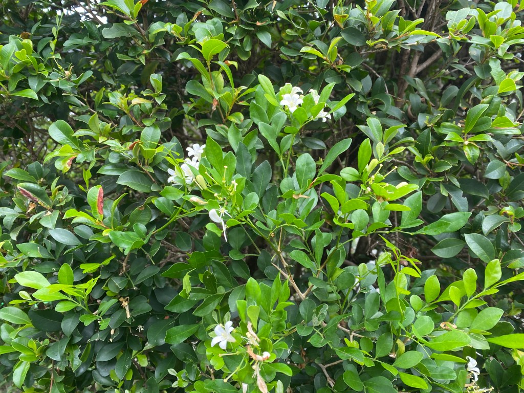 Murraya paniculata exotica aka – mock orange is a shrub like plant that is a great favourite for hedges here in Brisbane. When we first arrived and were looking for a house in this very month in 2013, I promised myself that I would buy one with such a hedge. It transported me back to a memory of the scent of orange groves in Famagusta when I was a child – and this one, mock though it is, is good enough for me. The shrub is called mock orange because its flowers and scent resemble that of an orange tree.We have one and it is glorious.