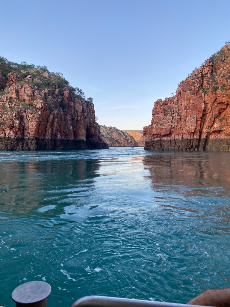 We explored the Horizontal Falls this morning and took a good look at the two gaps through the rocks. I could never quite understand how falls could be horizontal but I do now. The sediments in the rocks are varied. Some weather and some don’t. The weathered one caused the gaps in the rocks. Given that the Kimberley has one of the greatest tide changes in the world twice a day the tide can drop and build some 10 metres – and this pushes the water through the small gaps in huge volumes causing the effect of a fall – but on a horizontal level.We took exhilarating rides through the falls.