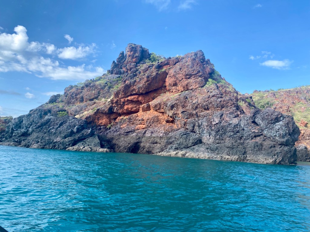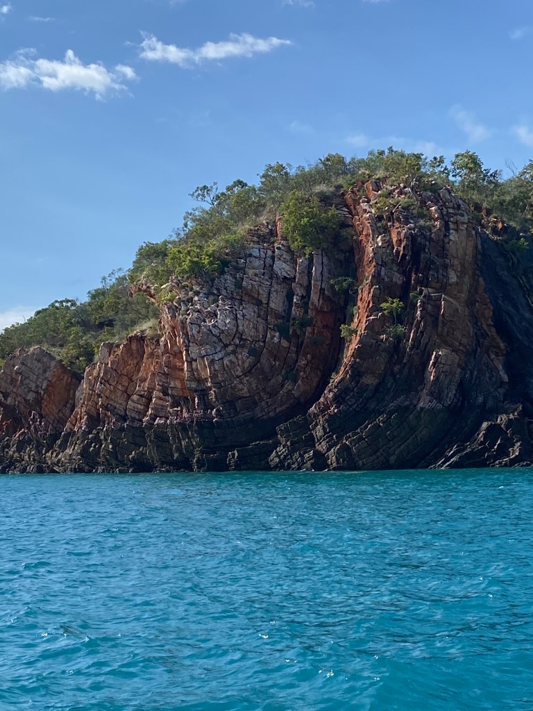 Today a visit to the Iron Islands, Koolan and Cockatoo Islands. Taking one look at the rocks here and you know they are full of haematite. Huge deposits and the mine in Koolan has been operating from 1951. It has exported 70 million tons of iron ore when BHP owned it and it continues to this day. In fact as we passed a tanker was being loaded with the ore.