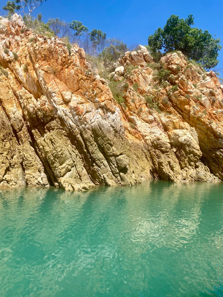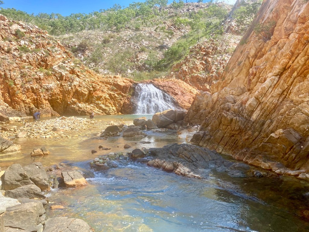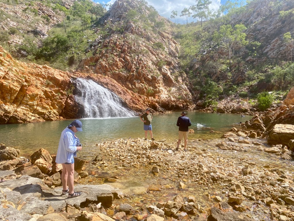 In the afternoon a ride to Crocodile Creek – along azure inlets and waterways until we reached a place where the fresh water gushed over the rock face. Teams of the crew looked for what might be lurking beneath and when we were given the all clear we headed in for a cool dip.