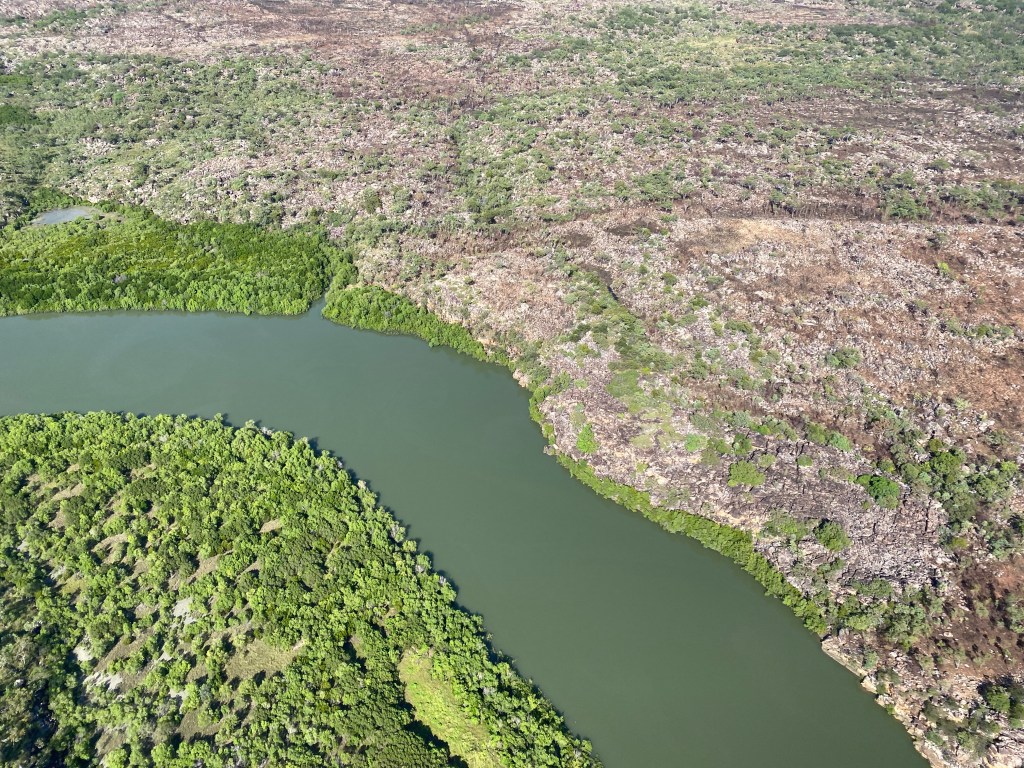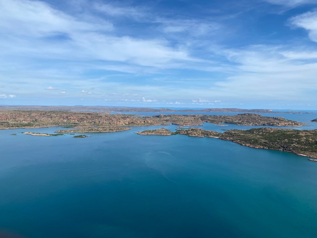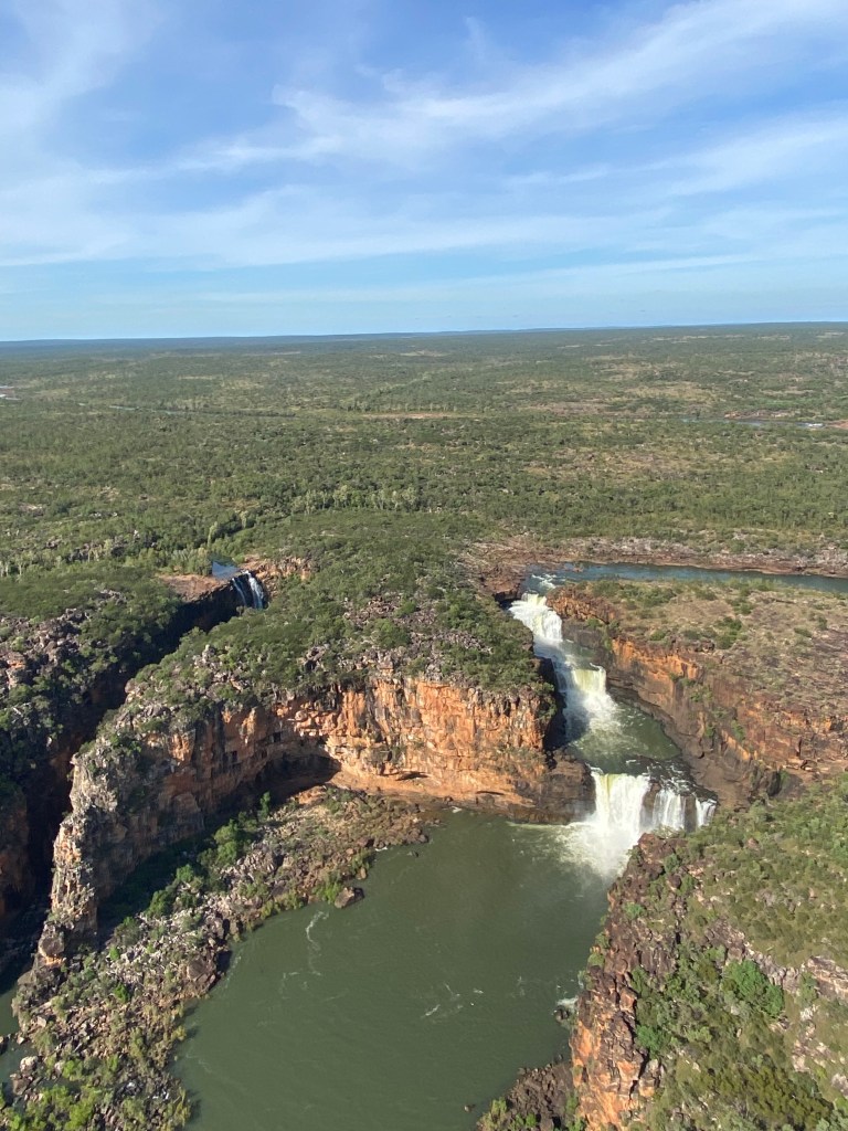We were picked up in a small four seater helicopter with no doors for good views ! We rose above the small island we were on and onto the mainland over huge expanses of rocky crags, river beds and creeks, eucalypt forests and grasslands going inland on the Mitchell River. The area is green and vibrant after the rains. Our destination the Falls which are thundering at the moment. There are four falls one after another down a very deep gorge. We arrive at the top and walk round to some wonderful view points. The falls are significant for the Wunambal people and home to the Wunggurr, the powerful creator snake.