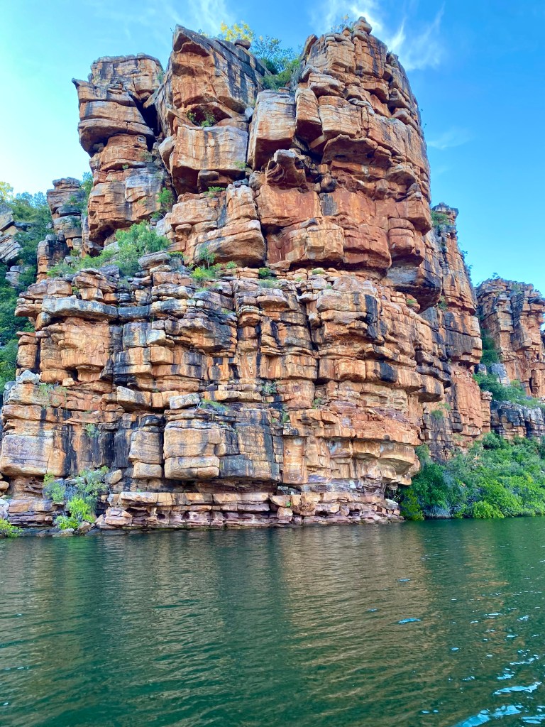 The river in itself is a stunning waterway of Sandstone cliffs with streaks of the cyanobacteria which form the black lines on the stones. Rocks perched on top of one another, some precariously balanced. It may look very different in a few years if there is an earth tremor or the rock figs dislodge some of the rocks. Behind two sentinel walls of sandstone the two falls appear. The story is that men carved the left waterfall and women the right – they both thundered down but the left was stronger and bigger – no surprises in that story line!